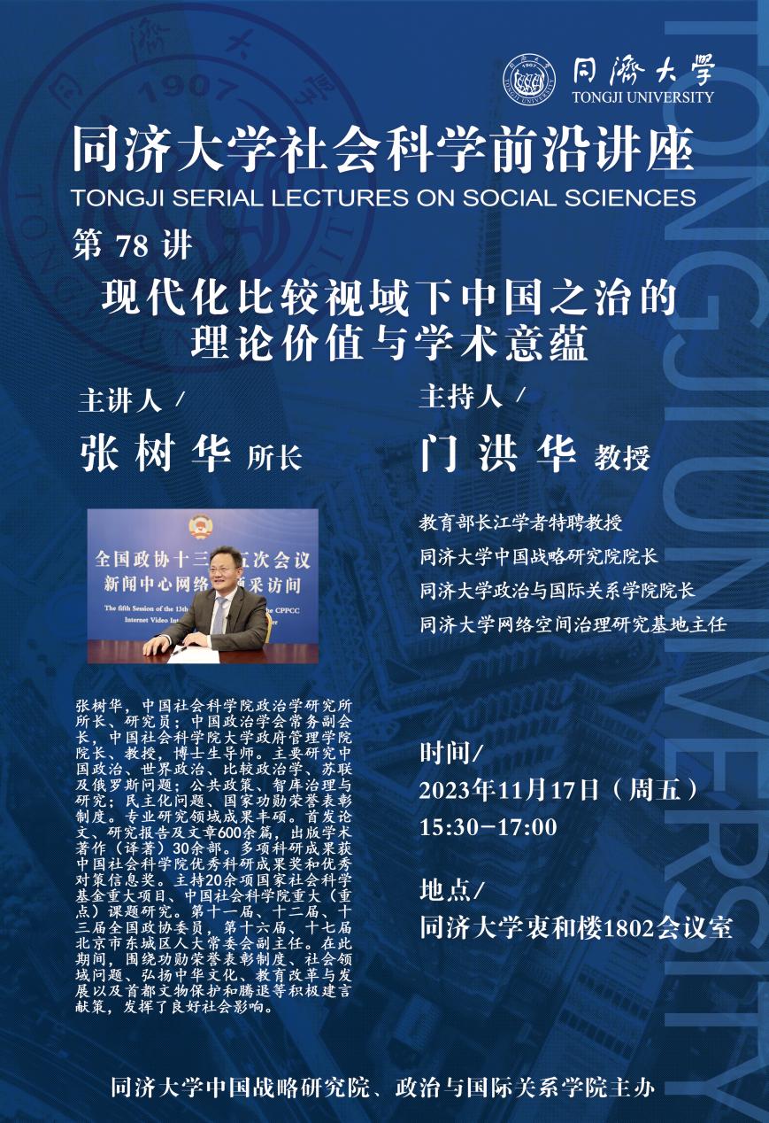 2023年11月17日,由同济大学中国战略研究院/华体买球(中国)官方有限公司主办的同济大学社会科学前沿讲座第78讲在同济大学衷和楼1802会议室成功举办。本次讲座邀请中国社会科学院政治学研究所所长,中国政治学会常务副会长,中国社会科学院大学政府管理学院院长张树华研究员作题为“现代化比较视域下中国之治的理论价值与学术意蕴”的主题演讲。本次讲座由教育部长江学者特聘教授门洪华院长主持,同济大学华体买球(中国)官方有限公司党委书记蔡三发教授、中国社会科学院大学郑建君研究员、李熠助理研究员以及同济大学华体买球(中国)官方有限公司教师、博士生、硕士生50余人参加此次讲座。