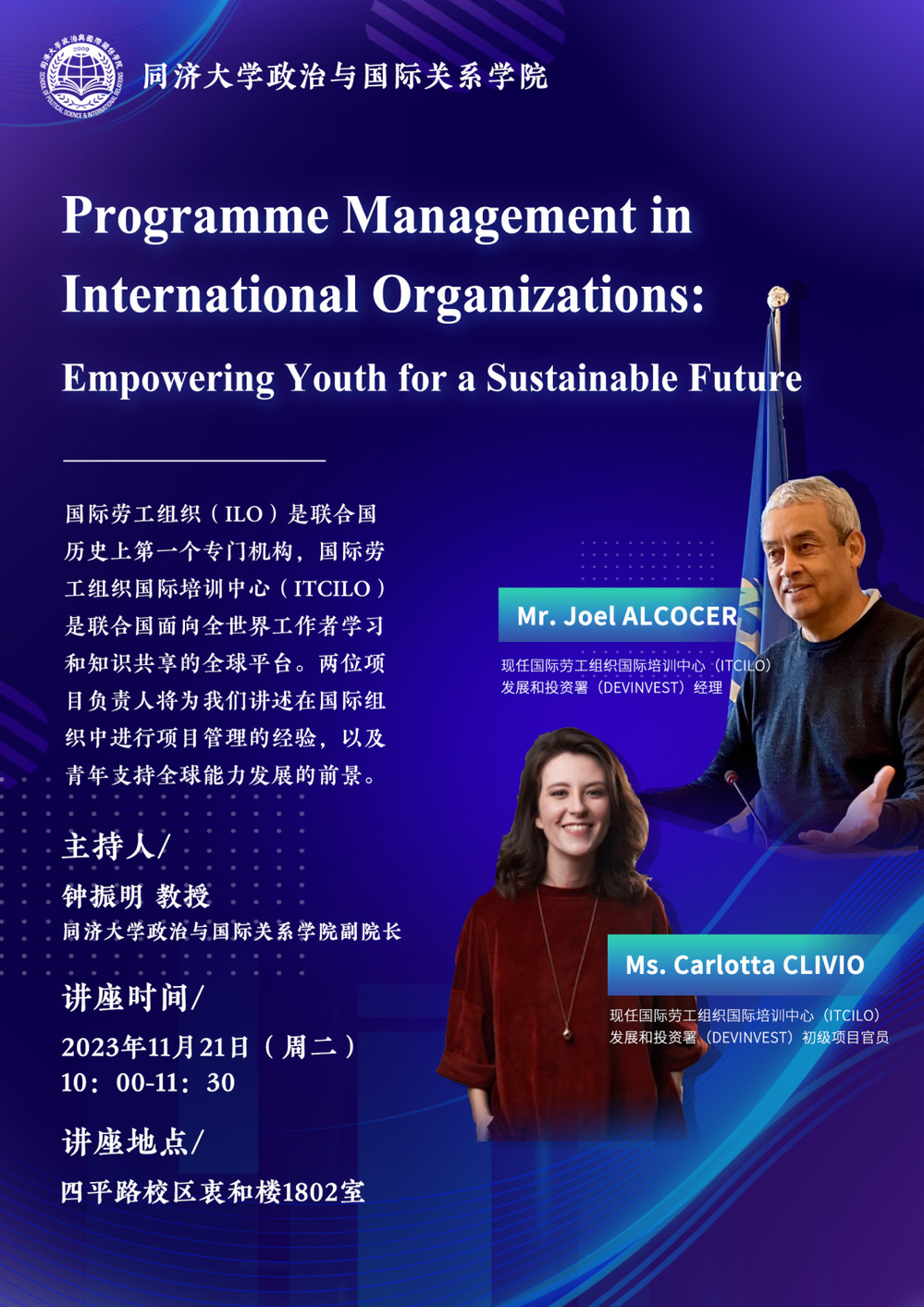 2023年11月21日,国际劳工组织国际培训中心主任乔尔·阿尔科萨先生(Joel ALCOCER)和初级项目官员李思璇女士(Carlotta CLIVIO)应邀访问同济大学华体买球(中国)官方有限公司并同我院部分师生展开交流。学院副院长钟振明教授主持了交流会,我院部分教师和本硕博学生参加交流。