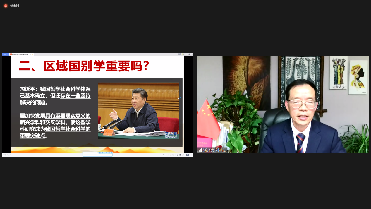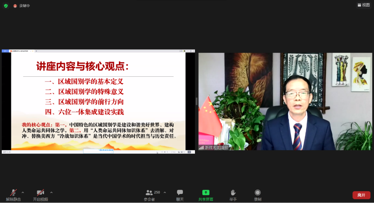 在本次讲座中,刘鸿武教授从“区域国别学的基本定义”“区域国别学的特殊意义”“区域国别学的前行方向”,以及如何对区域国别学进行“六位一体集成建设实践”四个方面展开了讲解。