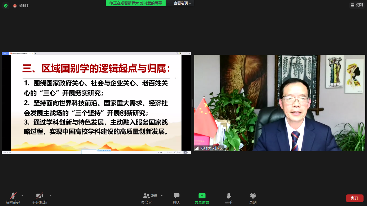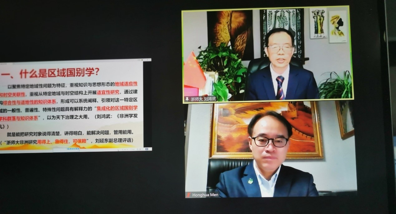 主题讲座结束后,刘鸿武教授在线上回答了同济大学师生们的提问,就国际关系、国际政治与区域国别研究的区别与联系,区域国别学如何做到理论化建设、区域国别学需要什么样的人才,以及浙江师范大学非洲研究院如何布局国别和区域的研究进行了专业和深刻的解答。