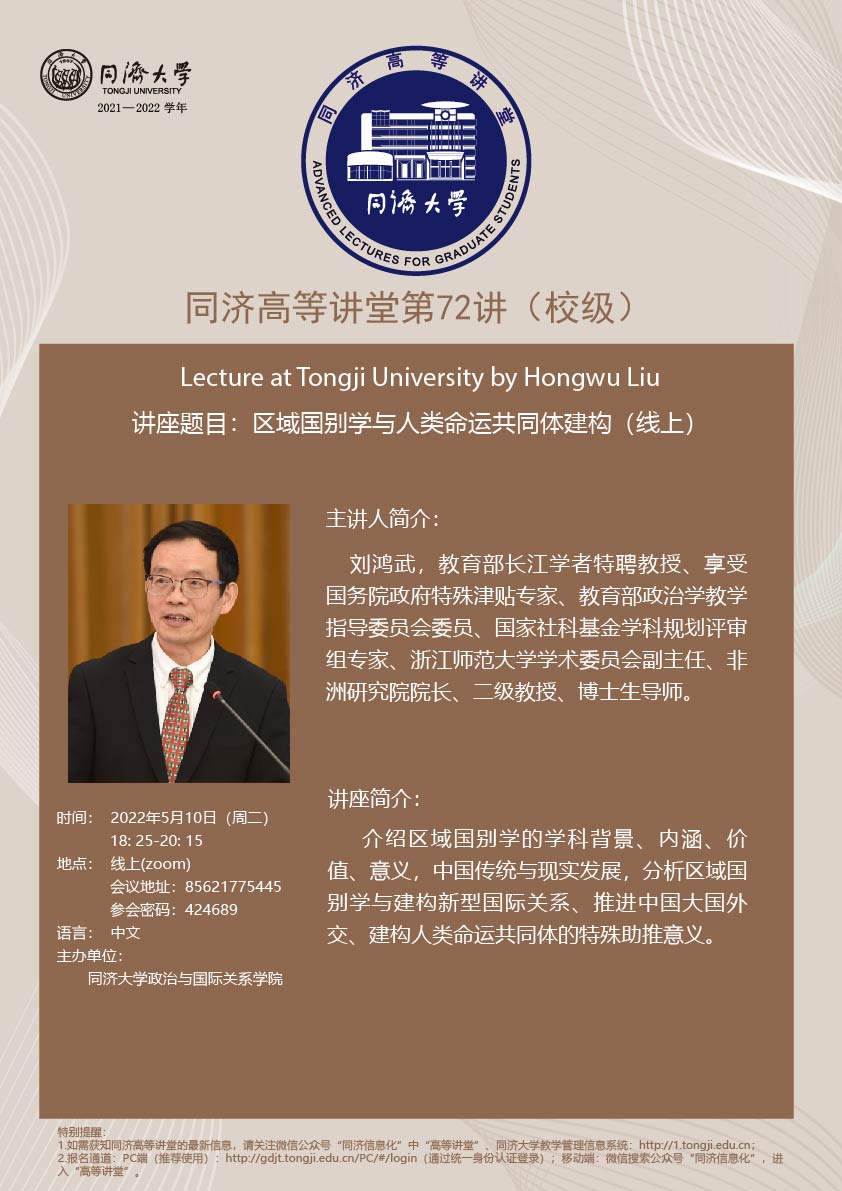 2022年5月10日,由同济大学中国战略研究院/华体买球(中国)官方有限公司主办的同济大学社会科学前沿讲座第44讲,同济高等讲堂第72讲在线上成功举办。本次讲座特别邀请教育部长江学者特聘教授、浙江师范大学非洲研究院院长刘鸿武教授作题为“区域国别学与人类命运共同体建构”的主题演讲。本次讲座由门洪华院长主持,来自同济大学、复旦大学、中国人民大学、华中科技大学、吉林大学、南开大学、云南大学、上海外国语大学等20多所高校近300名师生参加了此次线上学术讲座。