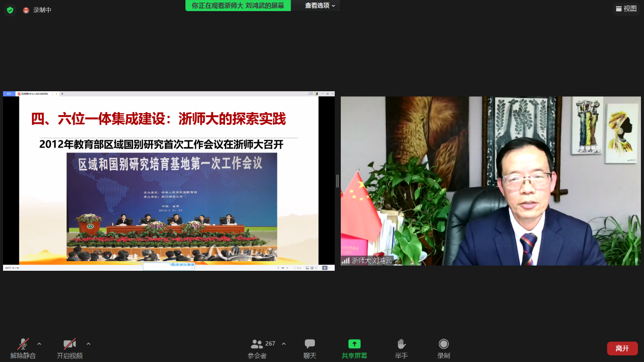 最后,刘鸿武教授结合浙江师范大学非洲研究院的探索实践解释了什么是六位一体集成建设以及如何促进区域国别学的六位一体集成建设。刘教授参与了全国哲学社会科学工作办公室组织的《中国特色哲学社会科学发展报告》的编撰工作,总结出“以学科建设为本体”“智库服务为功用”“媒体传播为手段”“扎根非洲为前提”“中非合作为路径”“协同创新以赋能”的六位一体集成实践原则。刘鸿武教授强调,建设好区域国别学,要做到校内外协同创新,由学科交叉协同进阶到交叉学科形成。