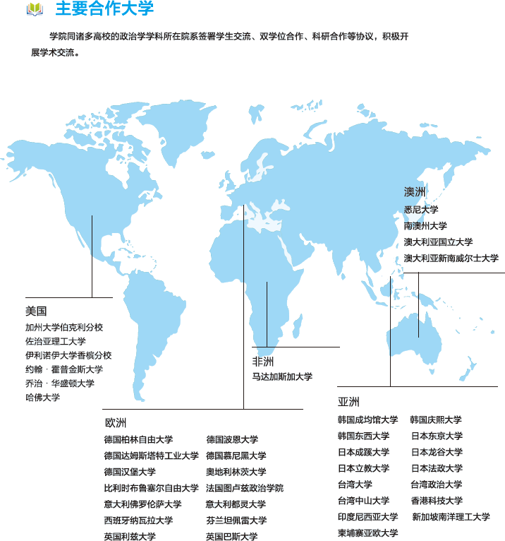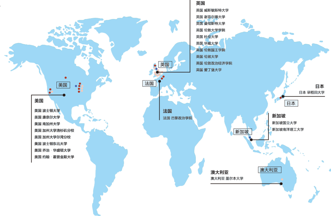 2、清华大学、北京大学、中国人民大学、约翰霍普金斯大学、早稻田大学、新加坡国立大学、南洋理工大学、伦敦政经学院、诺丁汉大学、柏林自由大学等。
