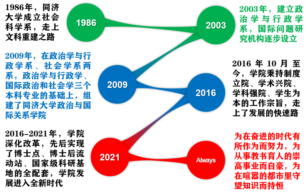 2016年10月至今,学院新增各类研究课题180余项,其中国家社科基金重大课题和教育部哲社重大项目5项、中宣部重大人才工程项目1项、教育部哲社后期资助重大课题1项、国家社科基金项目23项(其中重点项目1项);发表各类学术论文近500篇,其中CSSCI、SSCI等高水平论文300余篇,出版各类学术著作60余部,获得教育部、国家部委、上海市等科研奖励12项(其中第八届高校科研优秀成果奖2项)——学院已经成为同济大学文科学院中活跃自信的奋进旗手、上海市政治学与国际关系领域的重要代表、国内政治学学科学院中备受关注的新兴力量。