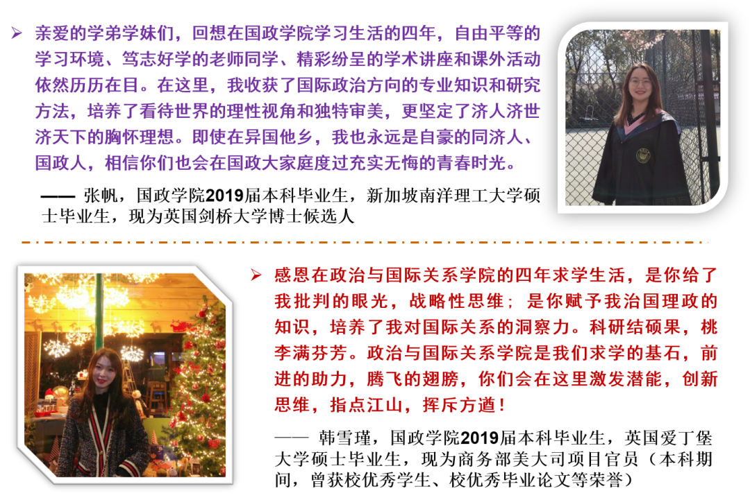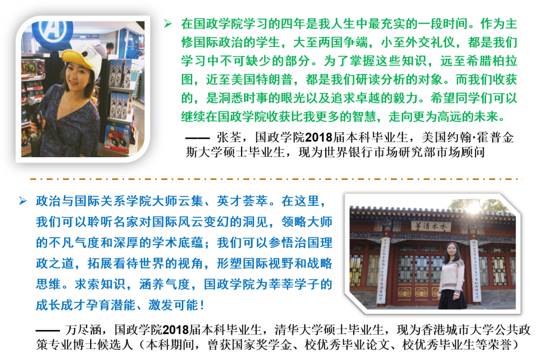 培养目标:作为“三全育人”试点学院,国政学院强调以立德树人为核心,致力于培养符合国家重大战略需求、具有世界眼光和战略思维、具备进行多学科交叉和跨学科解决重大现实问题的学术创新能力、通晓国家治理和国际事务的精英人才