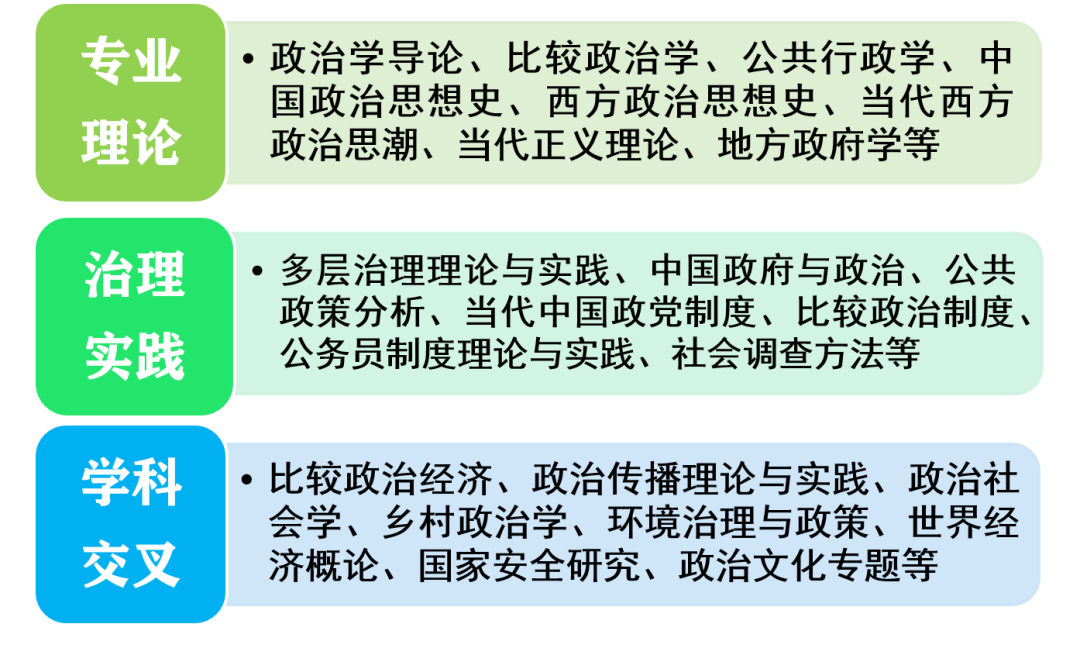 1、学术创新与工作能力并重,对接国家治理需求,培养兼具政治学理论深度和行政学基本素质的综合人才;