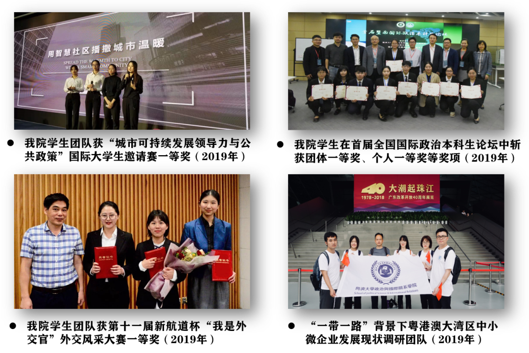 学院建立实践教学基地30余个,各专业学生在社会实践、创新创业等活动和竞赛中获得多项国家级、省部级和校级奖项,实现了学院积极举措的良性反馈。如上海市本科生社科论坛一等奖;在首届全国(暨南)国际政治本科生论坛中,斩获团体一等奖、个人一等奖等4项个人奖项;“创青春”全国大学生创业大赛实践挑战赛金奖;“创青春”全国大学生创业大赛公益创业赛金奖;“知行杯”上海市大学生社会实践项目大赛特等奖;第十六届“挑战杯”上海市大学生课外学术科技作品竞赛二等奖等,学生暑期社会实践团队先后荣获“上海市大学生优秀暑期社会实践团”“上海市优秀项目奖”等。