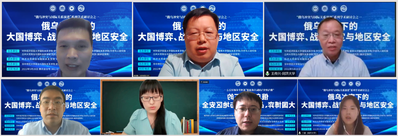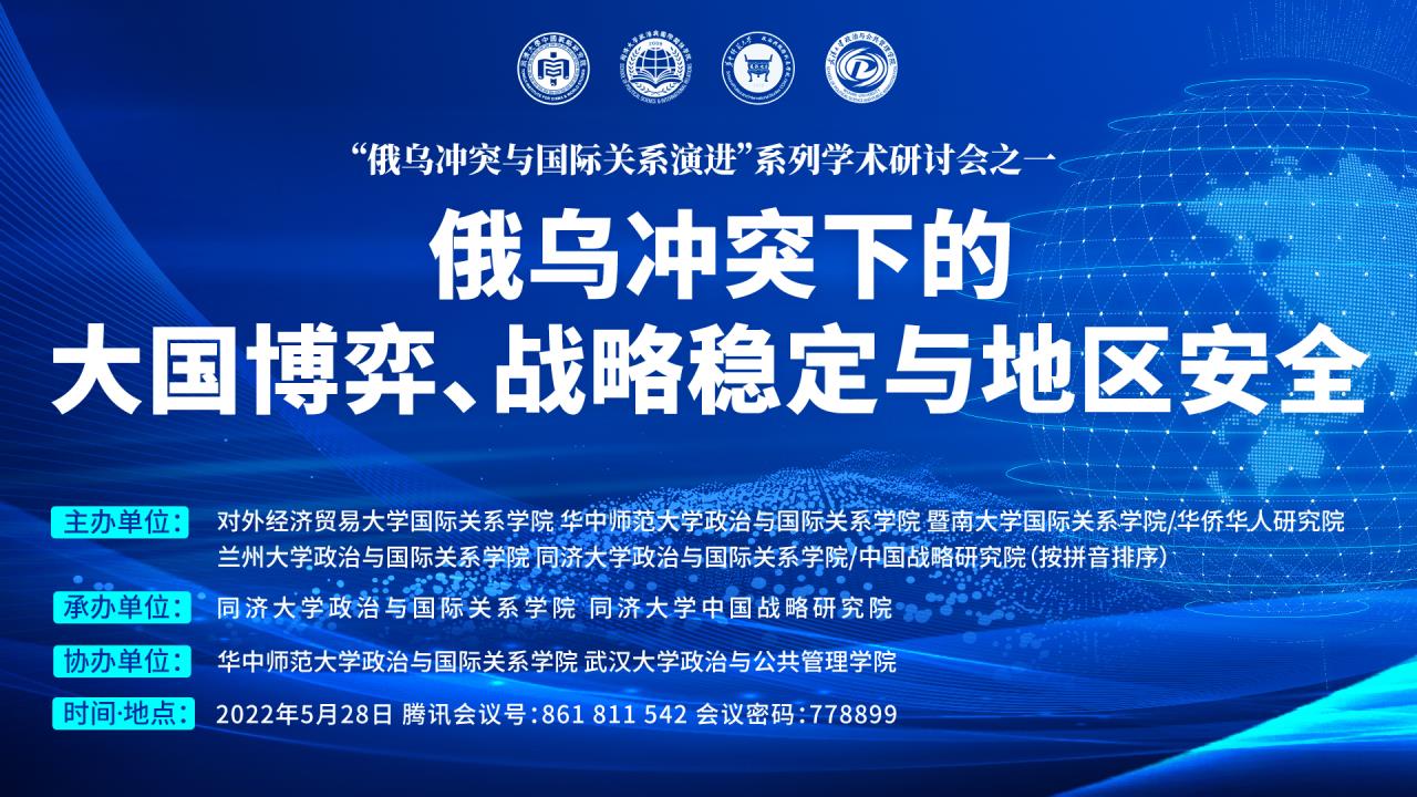 2022年5月28日,由同济大学华体买球(中国)官方有限公司、同济大学中国战略研究院承办,华中师范大学华体买球(中国)官方有限公司、武汉大学政治与公共管理学院协办的“俄乌冲突下的大国博弈、战略稳定与地区安全”学术研讨会在云端成功举办。本次会议系由对外经济贸易大学国际关系学院、华中师范大学华体买球(中国)官方有限公司、暨南大学国际关系学院、兰州大学华体买球(中国)官方有限公司、同济大学华体买球(中国)官方有限公司(以拼音为序)联合主办的“俄乌冲突与国际关系演进”系列学术研讨会的首期会议。来自同济大学、对外经济贸易大学、华中师范大学、暨南大学、兰州大学、武汉大学、复旦大学、中共中央党校、中共中央对外联络部、新华社瞭望智库研究院等科研院所与智库机构的20余位专家学者,围绕百年变局与新冠疫情相互交织的全新形势,特别是俄乌冲突背景下大国博弈的逻辑、战略稳定的需求和地区安全的互动,展开了多元而统一的学术讨论和观点表达。同时,本次学术研讨会还同步开放了线上直播,并吸引了来自国内外110多所院校机构的500余名师生参与聆听,云端观众络绎不绝。
