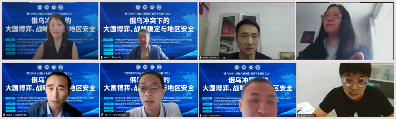 第一场研讨会的主题是“俄乌冲突下的大国博弈”,由对外经济贸易大学国际关系学院/国家安全与治理研究院院长戴长征教授主持。首先,武汉大学政治与公共管理学院副院长阮建平教授在分析俄乌冲突未来的发展趋势基础上,指出俄乌冲突可能会加剧中国经济发展面临的全球性挑战、增加中俄正常经贸交往的域外制裁风险、增加中国外交面临的平衡挑战和增加中俄战略协作的成本和风险等影响。对外经济贸易大学国家安全与治理研究院常务副院长、国际关系学院陈须隆教授指出,要将俄乌冲突置于世界大变局的宏大视野下进行考察,世界大变局将呈现“四化”趋势,即大国竞争激化、疫情形势分化、全球政经绿化和时代进步智化。同济大学华体买球(中国)官方有限公司教授、美国研究中心主任王传兴教授认为虽然俄乌冲突直接爆发在俄乌之间,但其影响是体系性的,进而对各大力量之间的博弈产生了重大影响。上海对外经济贸易大学法学院胡勇副教授从全球安全倡议的视角对俄乌冲突进行了详细阐述,指出国际社会应当一起努力,让全球安全倡议落地生根,开花结果,避免俄乌冲突的悲剧重演。兰州大学华体买球(中国)官方有限公司梁朕朋讲师聚焦于单元与结构互动的特征,探讨俄乌冲突下大国博弈的新特点。复旦大学社会科学高等研究院孟维瞻讲师从意识形态的角度,分析了俄乌冲突背后俄罗斯与西方世界之间的意识形态斗争。上海政法大学特聘副研究员、同济大学华体买球(中国)官方有限公司博士生丁迪聚焦于俄乌冲突下美国对华政策的演变,并提出了中国的应对措施。