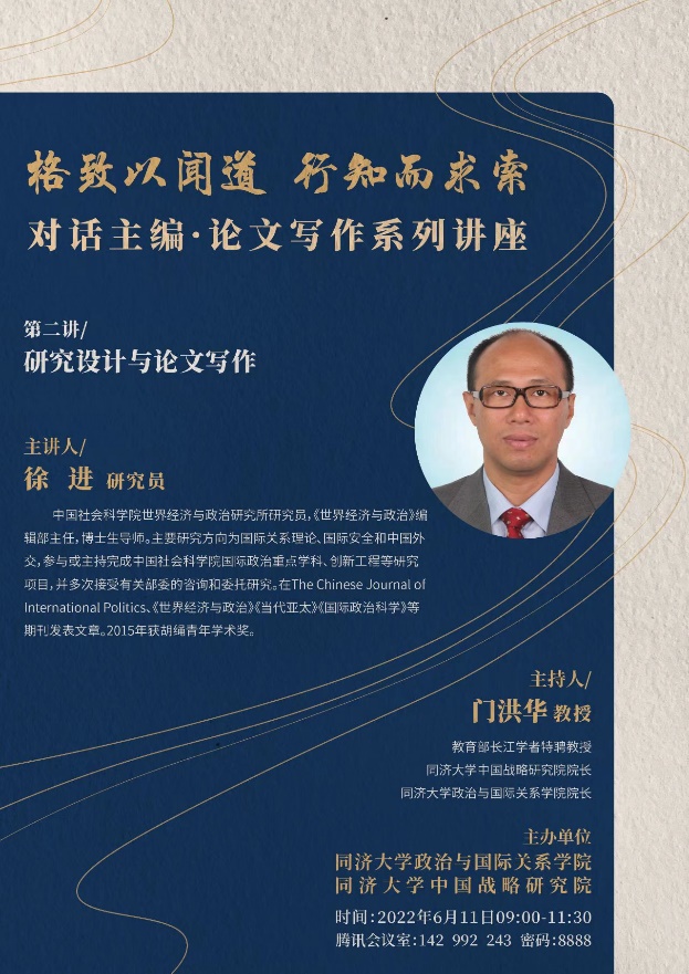 2022年6月11日上午,由同济大学华体买球(中国)官方有限公司/中国战略研究院主办的“格致以闻道 行知而求索”对话主编·论文写作系列讲座第二讲成功举办。本次讲座邀请中国科学院世界经济与政治研究所研究员、《世界经济与政治》编辑部主任、中国社科院大学国际政治系主任兼博士生导师徐进老师,作题为“研究设计与论文写作”的主题演讲。本次讲座由教育部长江学者特聘教授、同济大学中国战略研究院/华体买球(中国)官方有限公司院长门洪华教授主持,来自国内外70多个高校的1100余名师生参加了此次线上学术讲座。
