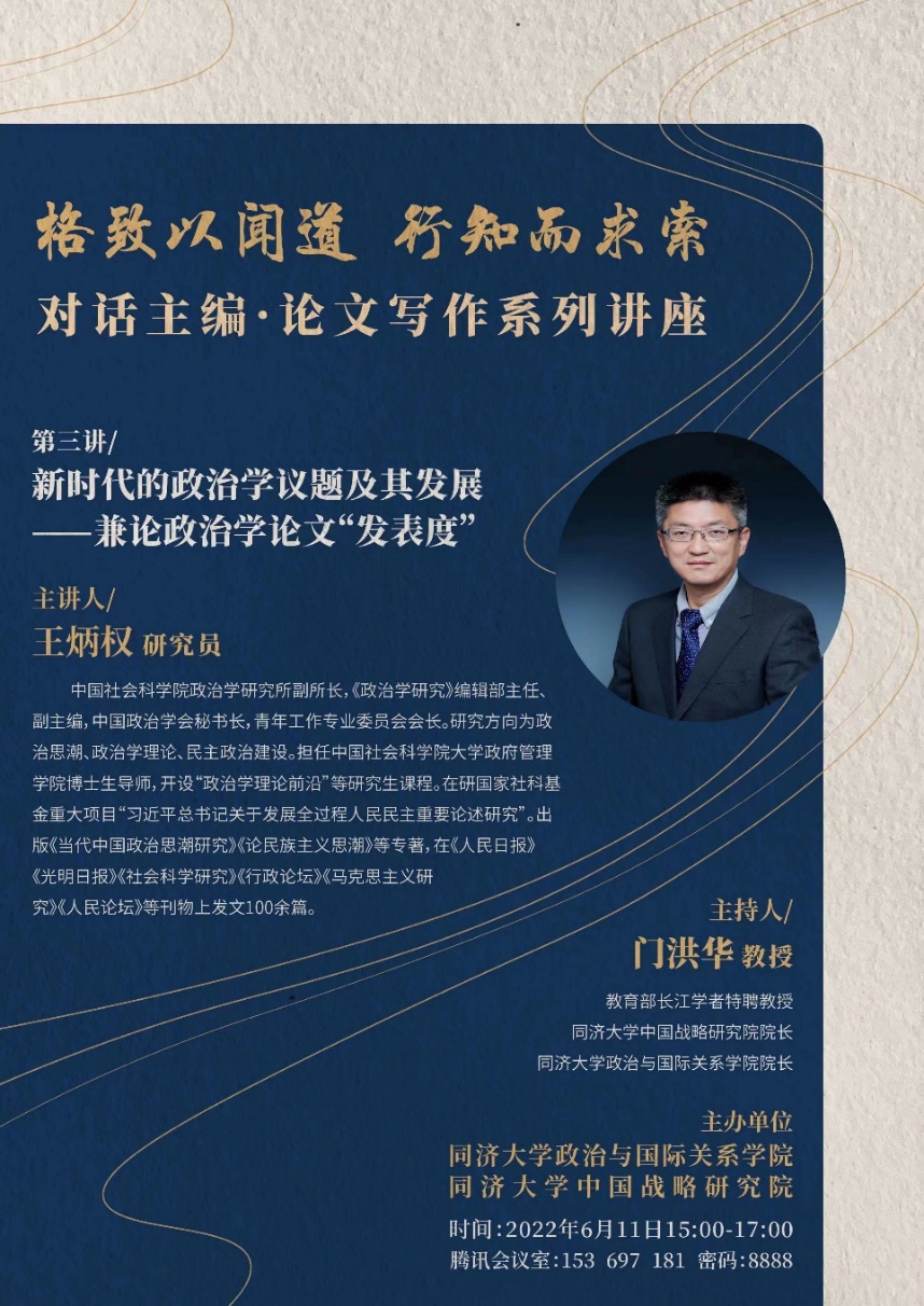2022年6月11日,由同济大学中国战略研究院/华体买球(中国)官方有限公司主办的“格致以闻道 行知而求索”对话主编·论文写作系列讲座第三讲成功举办。本次讲座邀请中国社会科学院政治学研究所副所长、中国政治学会秘书长、《政治学研究》编辑部主任兼副主编、中国社科院大学政府管理学院博士生导师王炳权教授,作题为“新时代的政治学议题及其发展——兼论政治学论文‘发表度’”的主题演讲。本次讲座由教育部长江学者特聘教授、同济大学中国战略研究院/华体买球(中国)官方有限公司院长门洪华教授主持,同济大学100余名师生参加了此次线上学术讲座。