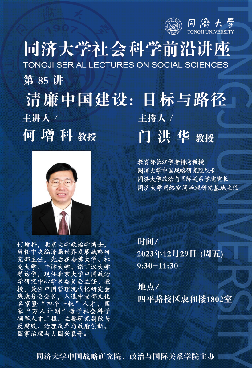2023年12月29日,由同济大学中国战略研究院/华体买球(中国)官方有限公司主办的同济大学社会科学前沿讲座第85讲在同济大学衷和楼1802会议室成功举办。本次讲座邀请北京大学中国政治学研究中心学术委员会主任何增科教授作题为“清廉中国建设:目标与路径”主题演讲。本次讲座由教育部长江学者特聘教授门洪华院长主持,同济大学华体买球(中国)官方有限公司教师、博士生、硕士生40余人参加此次讲座。