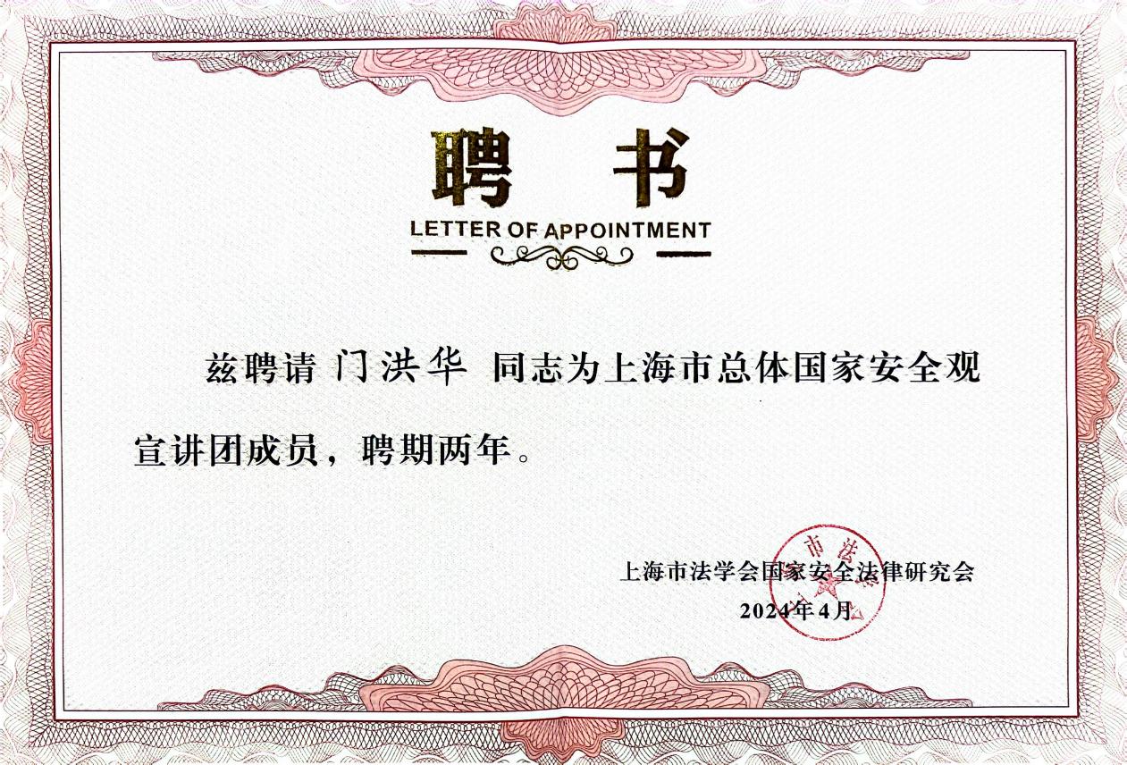 2024年4月,教育部长江学者特聘教授、同济大学中国战略研究院/华体买球(中国)官方有限公司院长、教育部哲学社会科学重大课题攻关项目“国家安全战略研究”首席专家门洪华教授受聘为上海市总体国家安全观宣讲团成员。