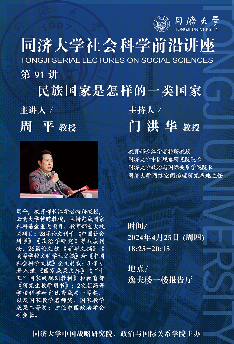 2024年4月25日,由同济大学中国战略研究院/华体买球(中国)官方有限公司主办的同济大学2024年度校级高等讲堂第80讲、同济大学社会科学前沿讲座第91讲在同济大学逸夫楼一楼报告厅成功举办。本次讲座邀请教育部长江学者特聘教授、中国政治学学会副会长、云南大学特聘教授周平先生作题为“民族国家是怎样的一类国家”的主题演讲。本次讲座由教育部长江学者特聘教授门洪华院长主持,同济大学教师、博士生、硕士生300余人参加了此次讲座。