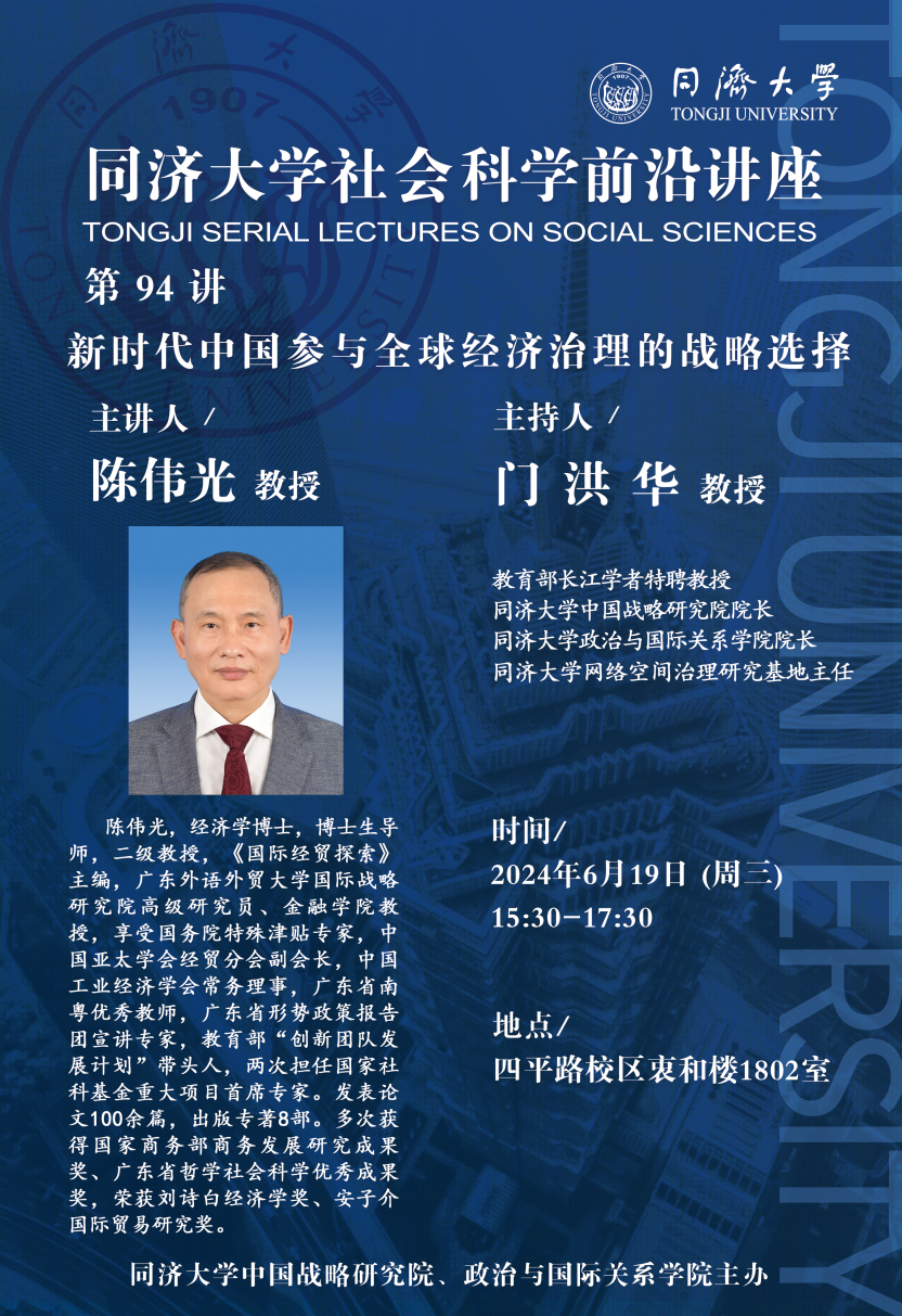2024年6月19日,由同济大学中国战略研究院/华体买球(中国)官方有限公司主办的同济大学社会科学前沿讲座第94讲在同济大学衷和楼1802会议室成功举办。本次讲座邀请广东外语外贸大学二级教授、《国际经贸探索》主编、中国工业经济学会副理事长陈伟光教授作题为“新时代中国参与全球经济治理的战略选择”的主题演讲。本次讲座由教育部长江学者特聘教授门洪华院长主持,同济大学华体买球(中国)官方有限公司教师、博士生、硕士生40余人参加此次讲座。