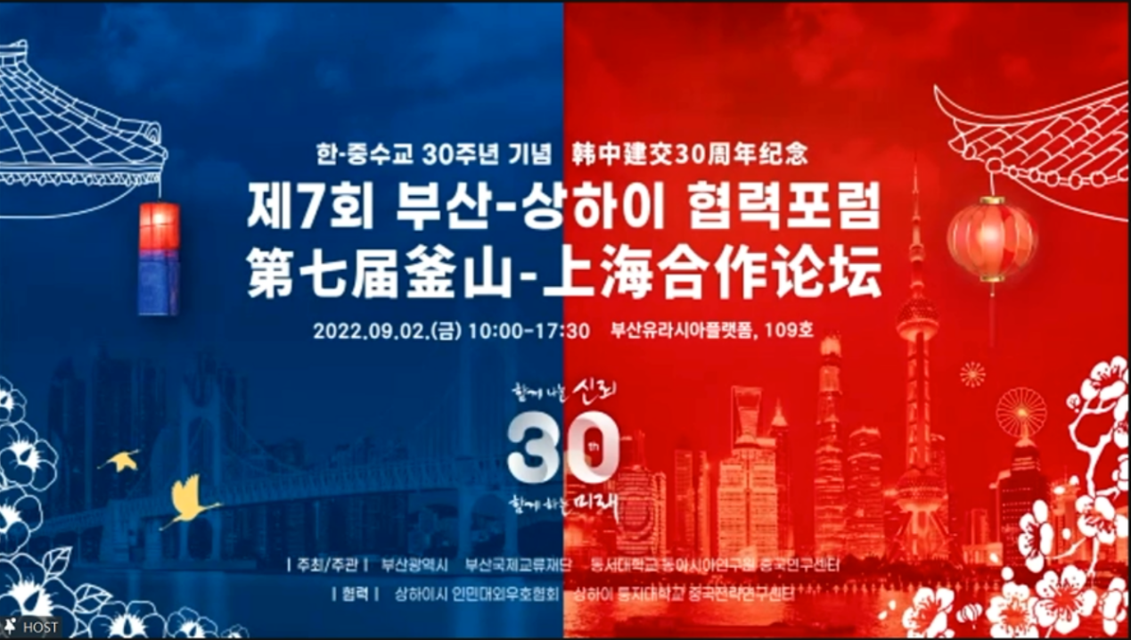 2022年9月2日,由同济大学中国战略研究院、韩国东西大学东亚研究院中国研究中心共同合作的第七届上海-釜山合作论坛暨中韩建交30周年纪念国际研讨会成功举办。本次论坛由韩国东西大学东亚研究院中国研究中心承办,由韩国釜山国际交流财团和上海市人民对外友好协会合作参与。来自同济大学、北京大学、复旦大学、吉林大学、中国社会科学院、上海社会科学院、上海师范大学等单位的20余位中国专家学者在线上参与论坛,同济大学党委副书记吴广明、中国前驻韩国大使/同济大学韩国研究中心名誉主任宁赋魁、中国前驻韩国大使邱国洪、上海市人民对外友好协会副会长景莹、中国驻釜山副总领事涂敬昌出席并致辞发言。同时,来自东西大学、国立外交院、国立釜山大学、国立仁川大学、韩国外国语大学、釜山经济振兴院、釜山研究院等机构的20余位韩国专家学者在线上展开交流,东西大学校长张济国、韩国前驻中国大使/东西大学东亚研究院院长辛正承、韩国前东北亚合作大使丁相基、韩国驻上海总领事金胜镐、釜山国际交流财团事务总长郑钟弼出席并致辞发言。