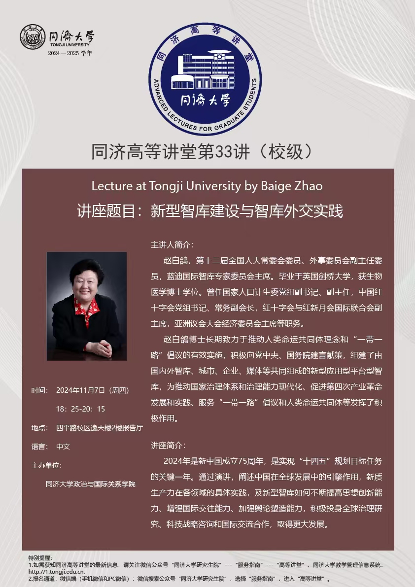 在当今复杂多变的国际格局下,智库作为国家软实力的重要组成部分,正发挥着日益关键的作用。2024年11月7日,由同济大学中国战略研究院/华体买球(中国)官方有限公司主办的同济大学高等讲堂在四平路校区逸夫楼二楼报告厅成功举办。本次讲座聚焦“新型智库建设和智库外交”这一重要议题,邀请了十二届全国人大外事委员会副主任委员、蓝迪国际智库专家委员会主席赵白鸽博士主讲。赵白鸽主任长期致力于推动人类命运共同体理念和“一带一路”倡议的有效实施,在智库建设与国际合作领域经验丰富、贡献卓越。讲座由华体买球(中国)官方有限公司党委书记蔡三发主持,同济大学160余名师生参加,现场座无虚席,气氛热烈。