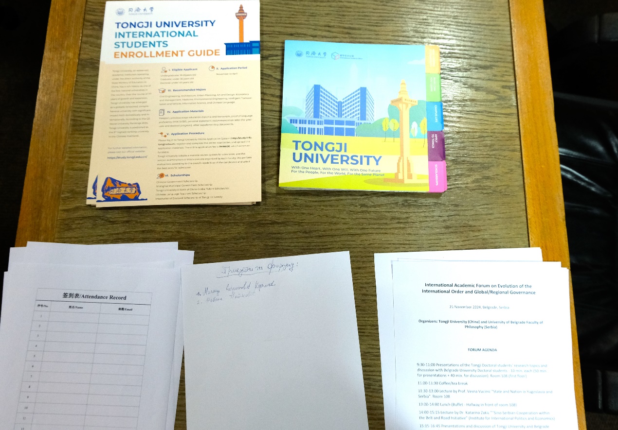 会议期间同济大学的学生还向贝尔格莱德大学的学生们进行了同济大学招收国际留学生的宣介并分发了同济大学的英文招生材料。