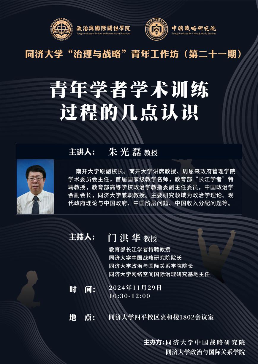 2024年11月29日,由同济大学中国战略研究院/华体买球(中国)官方有限公司主办的同济大学“治理与战略”青年工作坊第二十一期在同济大学衷和楼1802会议室成功举办。本次讲座邀请南开大学原副校长、南开大学讲席教授、周恩来政府管理学院学术委员会主任朱光磊教授作题为“青年学者学术训练过程的几点认识”的主题演讲。本次讲座由门洪华院长主持,同济大学华体买球(中国)官方有限公司青年教师、博士生40余人参加此次讲座。