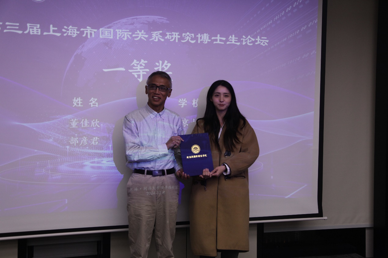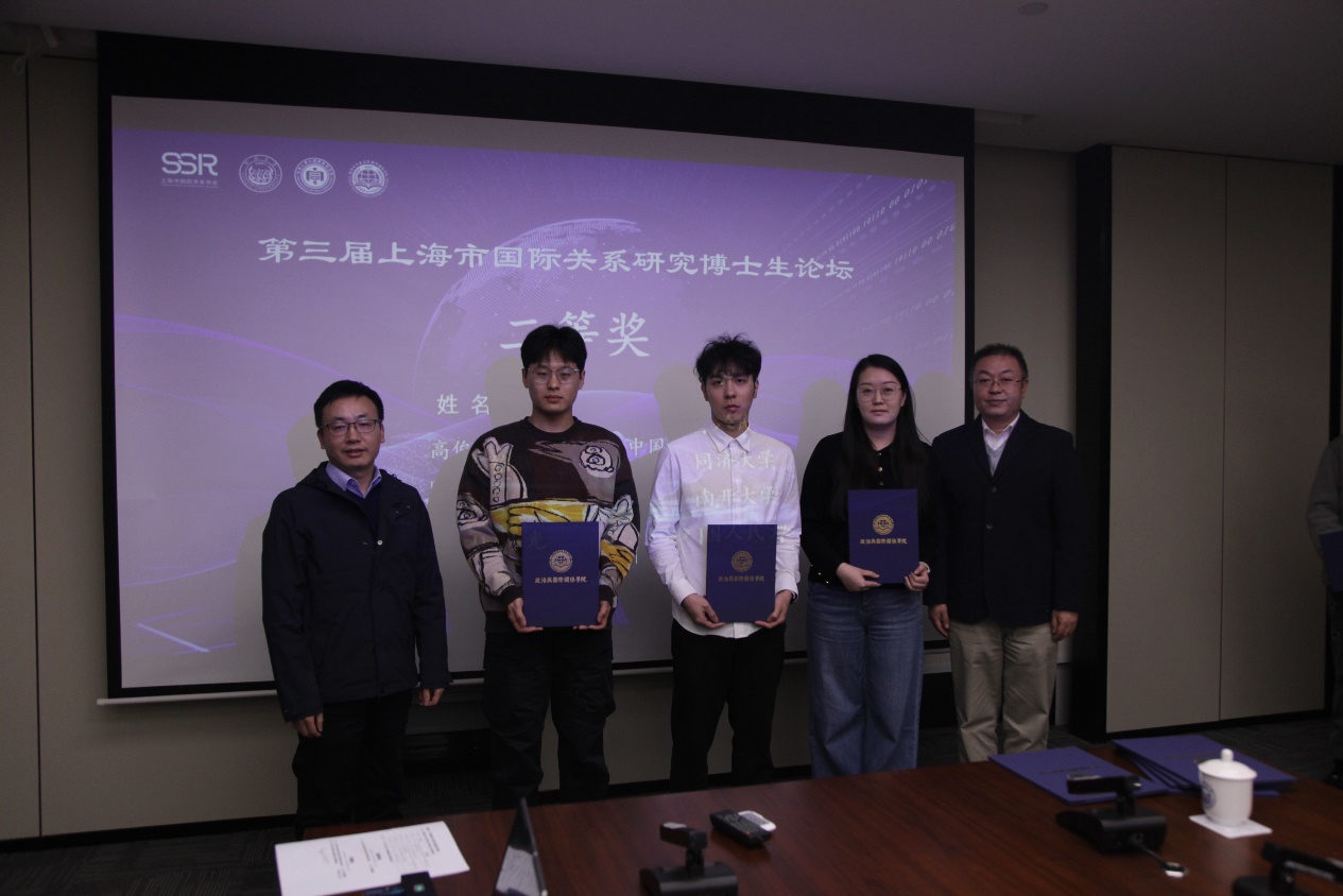 随后,本此论坛进入颁奖环节,颁奖典礼由同济大学华体买球(中国)官方有限公司院长助理吕蕊副教授主持。她介绍指出,本次论坛秉持“科学公正、认真负责、严格评审、优中选优”的原则,最终评出一等奖2名,二等奖4名,三等奖5名,优秀奖8名。其中,董佳欣、部彦君荣获第三届上海市国际关系研究博士生论坛一等奖,高俊杰、陈铭辉、刘锦、杜洞光获二等奖,李清扬、刘语默、田绍钧、万堃、周心培荣获三等奖,李航、胡童飞、刘彦彤、李妍卓、黄雪敏、赵新雷、赖爽、李优荣获优秀奖。