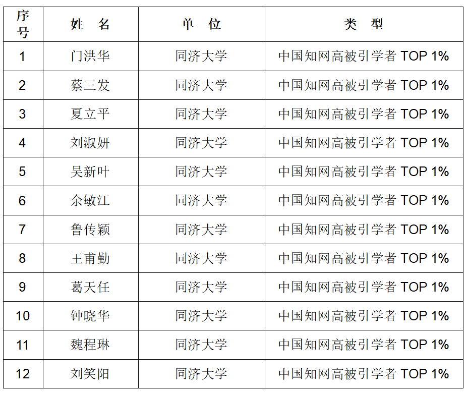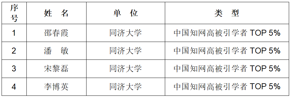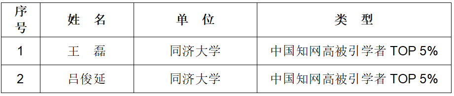 在此次评选中,同济大学华体买球(中国)官方有限公司共有12名教师入选“2024中国知网高被引学者TOP 1%”榜单,分别是:
