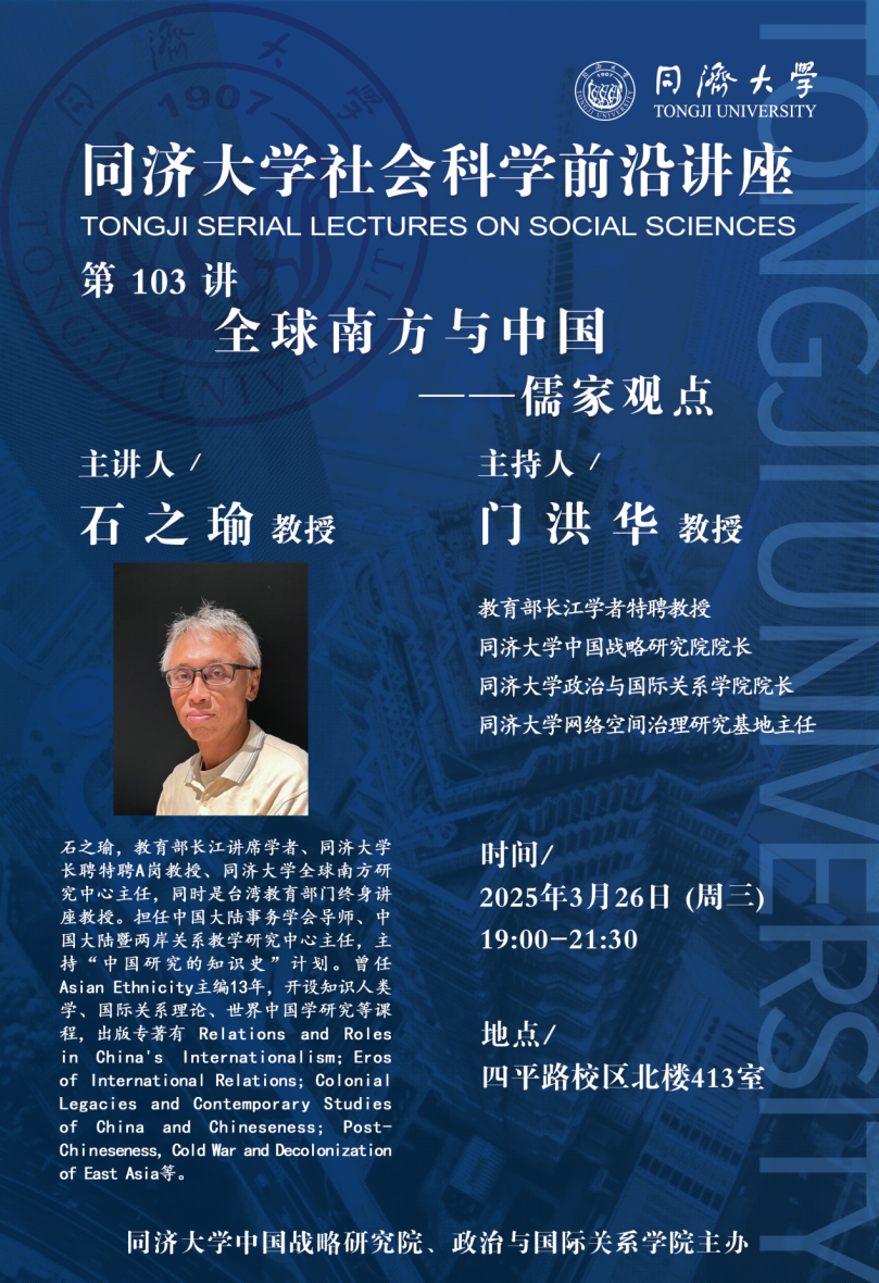 2025年3月26日,由同济大学中国战略研究院、华体买球(中国)官方有限公司主办的同济大学社会科学前沿讲座第103讲在同济大学四平校区北楼413室成功举办。本次讲座由教育部长江讲席学者、同济大学全球南方研究中心主任石之瑜教授主讲,主题为“全球南方与中国——儒家观点”。本次讲座由教育部长江学者特聘教授、同济大学中国战略研究院/华体买球(中国)官方有限公司院长门洪华教授主持,同济大学华体买球(中国)官方有限公司教师和研究生、同济大学20余个专业的本科生120余人参加。