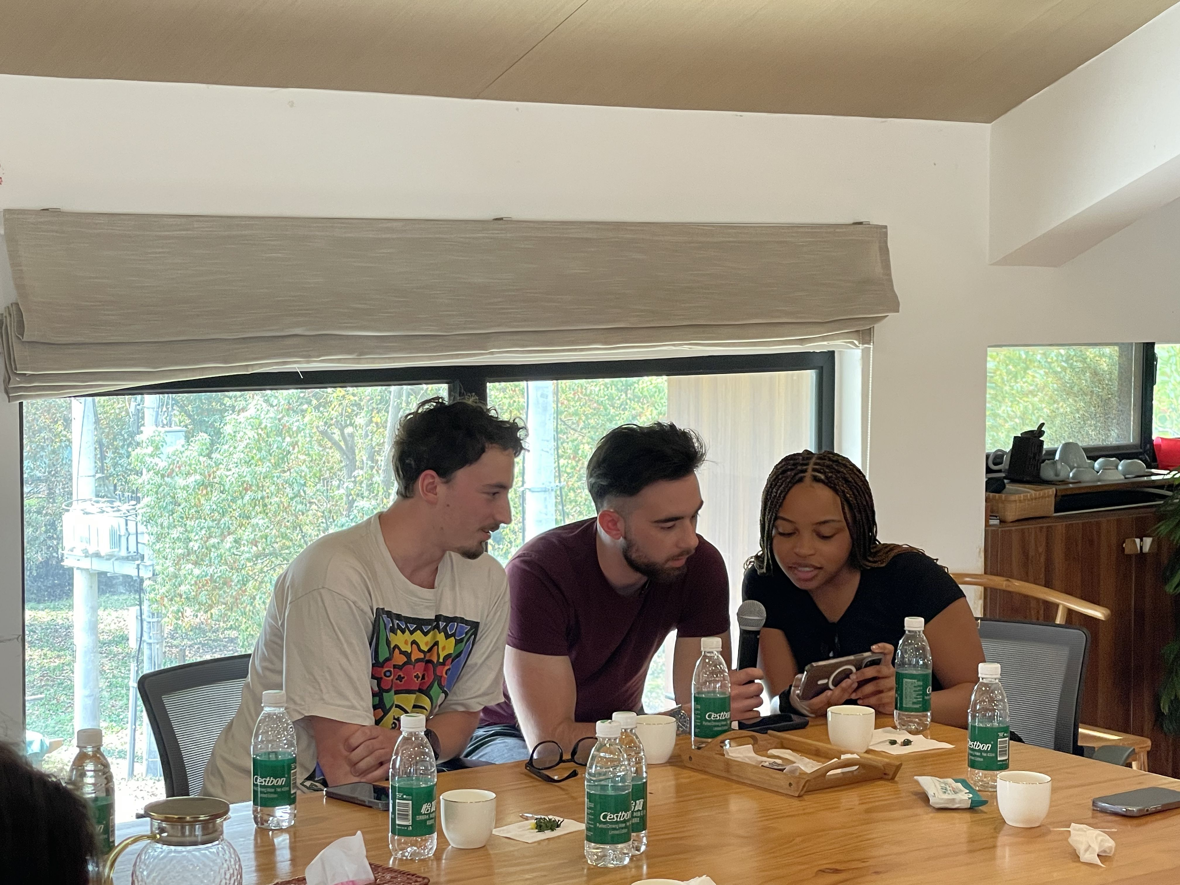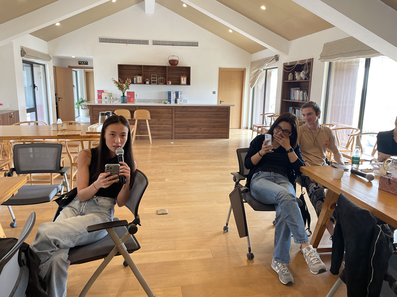 而后,同学们来到多功能会议厅,在钟晓华老师和刘渝梅老师的带领下,在这里座谈、研讨。来自不同国家和文化背景的同学们,就所见所闻和学习心得展开交流。品茗谈笑间,不同的文化在这里碰撞,多元的知识在这里汇集,迸放出炫丽的思想火花。