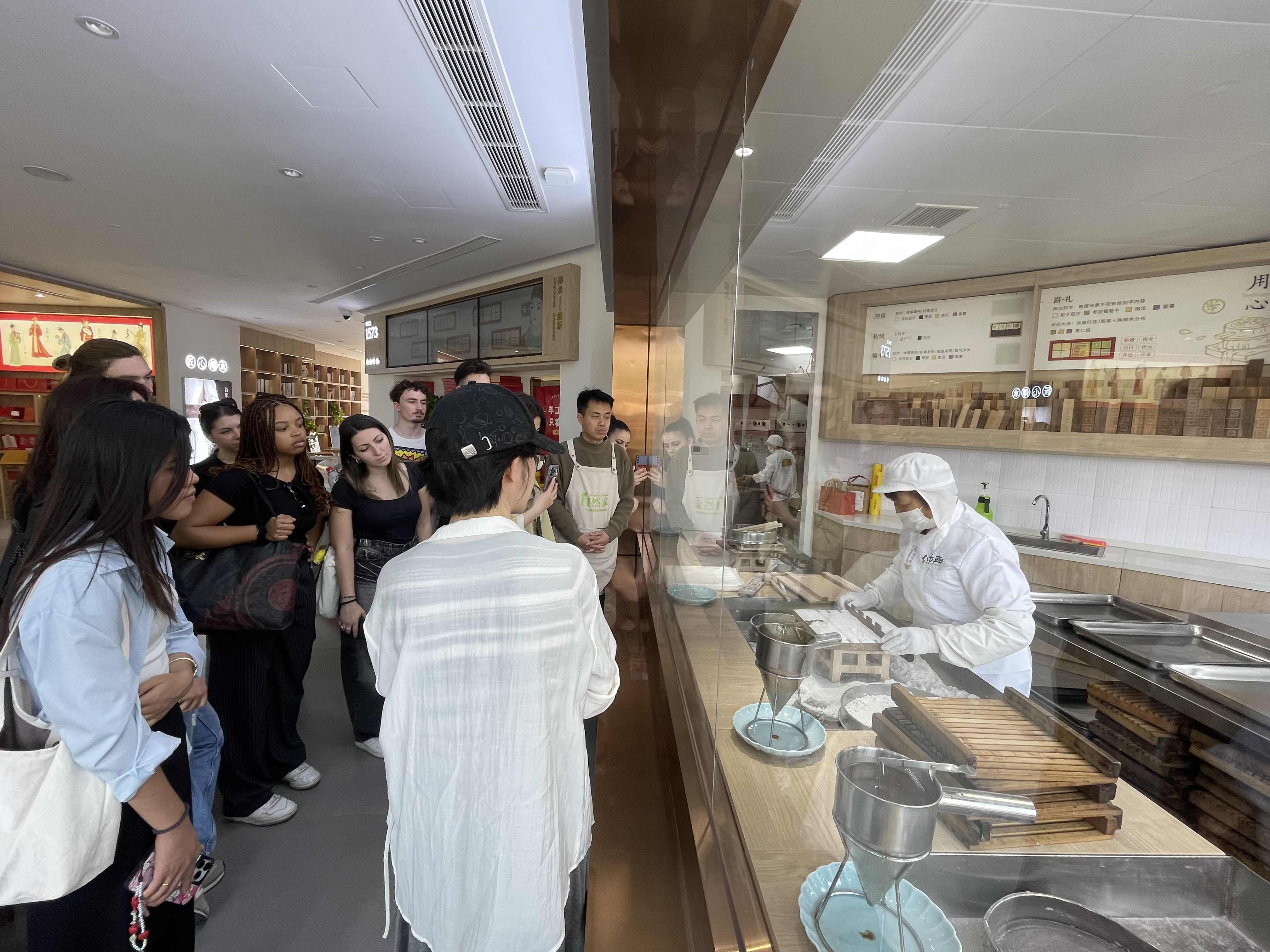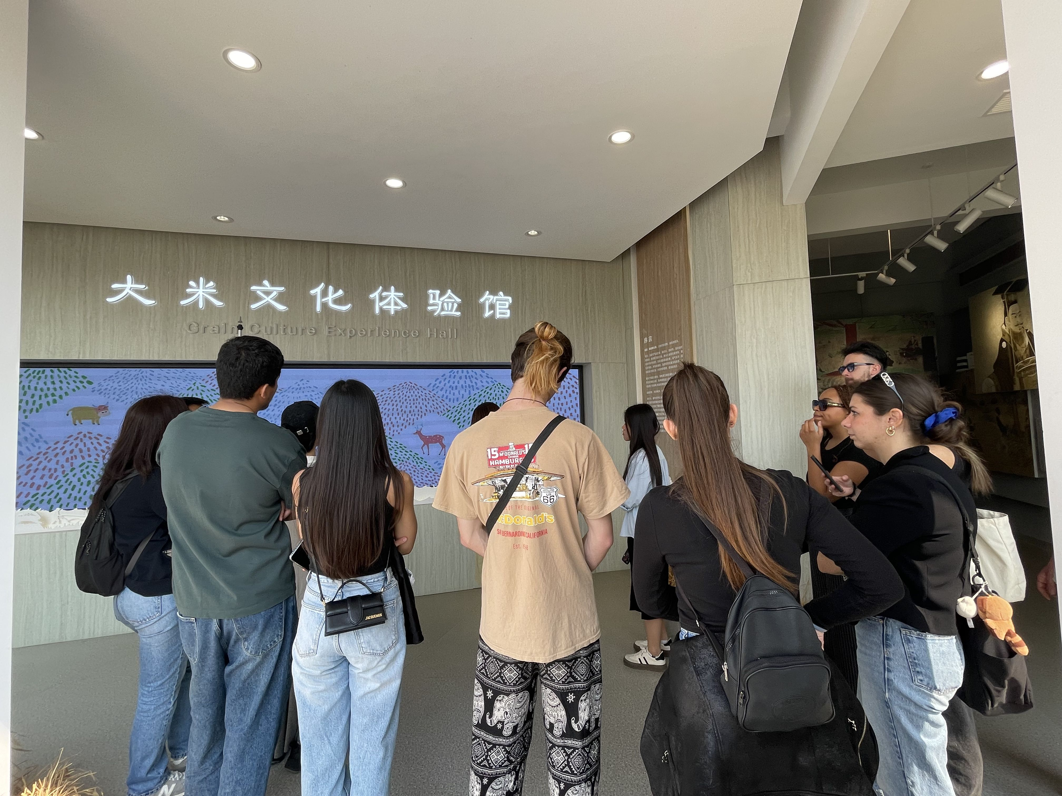 穿过田野,同学们来到建设在稻田中间的“大米文化体验馆”,在这里参观展览,了解稻米的农耕历史以及中国特有的农业文化。大家还饶有兴趣地观摩了非物质文化遗产——有着400多年历史的叶榭软糕的制作。工作人员邀请大家品尝这种出自传统手工的本地点心,散发着大米清香的叶榭软糕让异国的学子们赞不绝口。