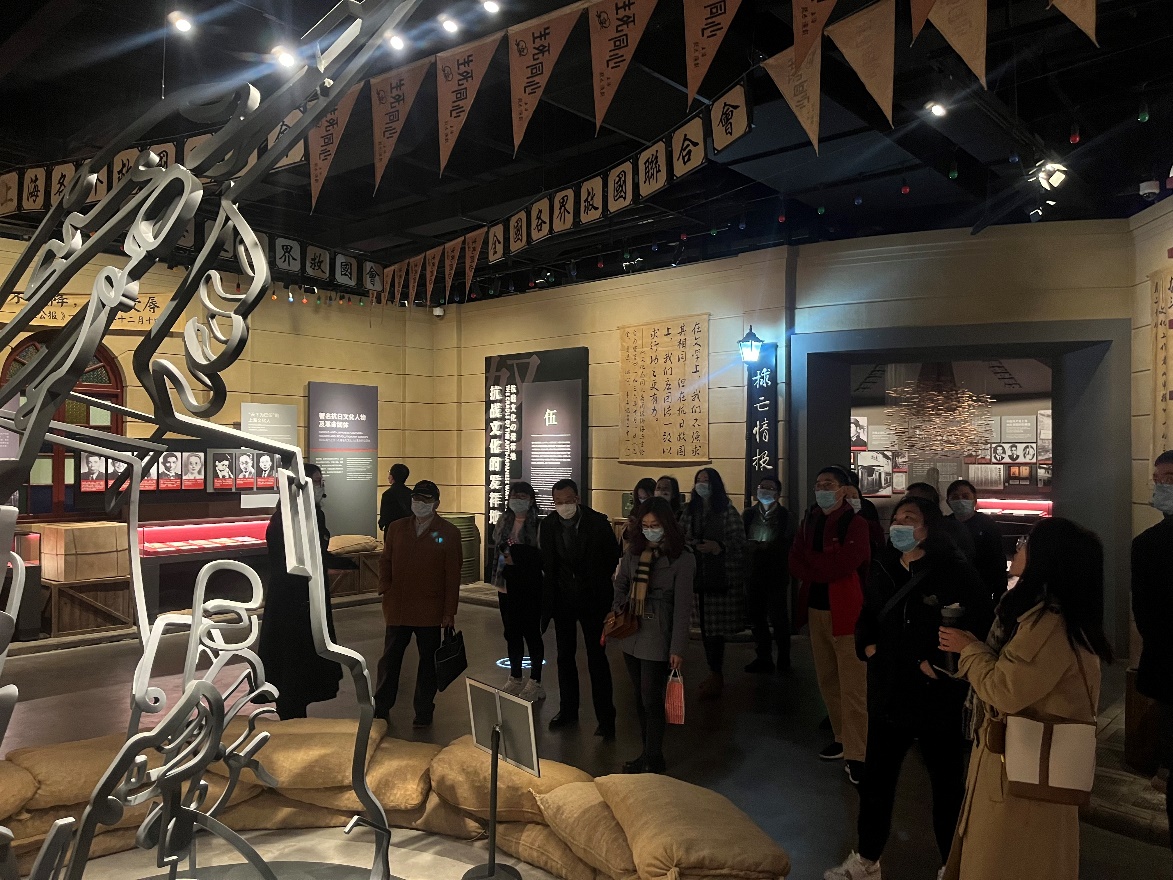 红色大巴首先载着教师们前往淞沪抗战纪念馆开展党史学习考察。在淞沪抗战纪念馆,全体教师聆听着讲解员深情的讲述,瞻仰着大量珍贵的历史图片和影像资料、细看各种抗战英烈留下的文物,大家仿佛回到上世纪30年代,面对深重的民族危机,在中国共产党倡导建立的抗日民族统一战线旗帜下,上海人民为“救亡图存”而浴血奋战14年的峥嵘岁月。无论是“义勇军海塘退敌”、“众店员舍身取义”、“罗店镇白衣勇士”,还是“小英雄方塔就义”、“和籍团血洒江湾”,这一幅幅震撼心灵的历史画卷以及其中蕴含的可歌可泣的英雄事迹,都彰显着中国人民在抗日战争及世界反法西斯战争中作出的巨大牺牲和伟大贡献,给大家留下了非常深刻的印象。
