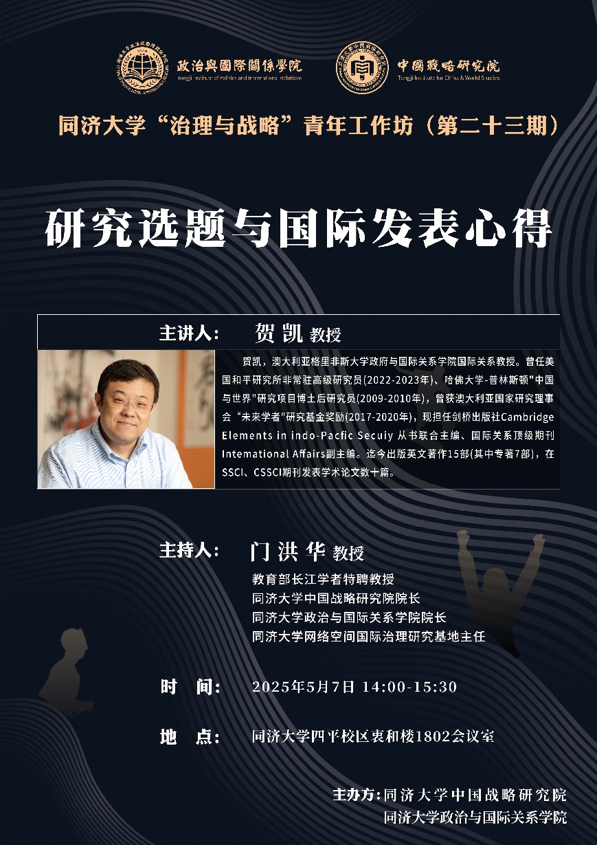 2025年5月7日,由同济大学中国战略研究院/华体买球(中国)官方有限公司主办的同济大学“治理与战略”青年工作坊第二十三期在同济大学衷和楼1802会议室成功举办。本次讲座邀请澳大利亚格里菲斯大学治理与公共政策研究中心主任、政府与国际关系学院贺凯教授作题为“研究选题与国际发表心得”的主题演讲。本次讲座由教育部长江特聘教授门洪华院长主持,同济大学华体买球(中国)官方有限公司及校内外教师、博士生、硕士生30余人参加了此次学术讲座。