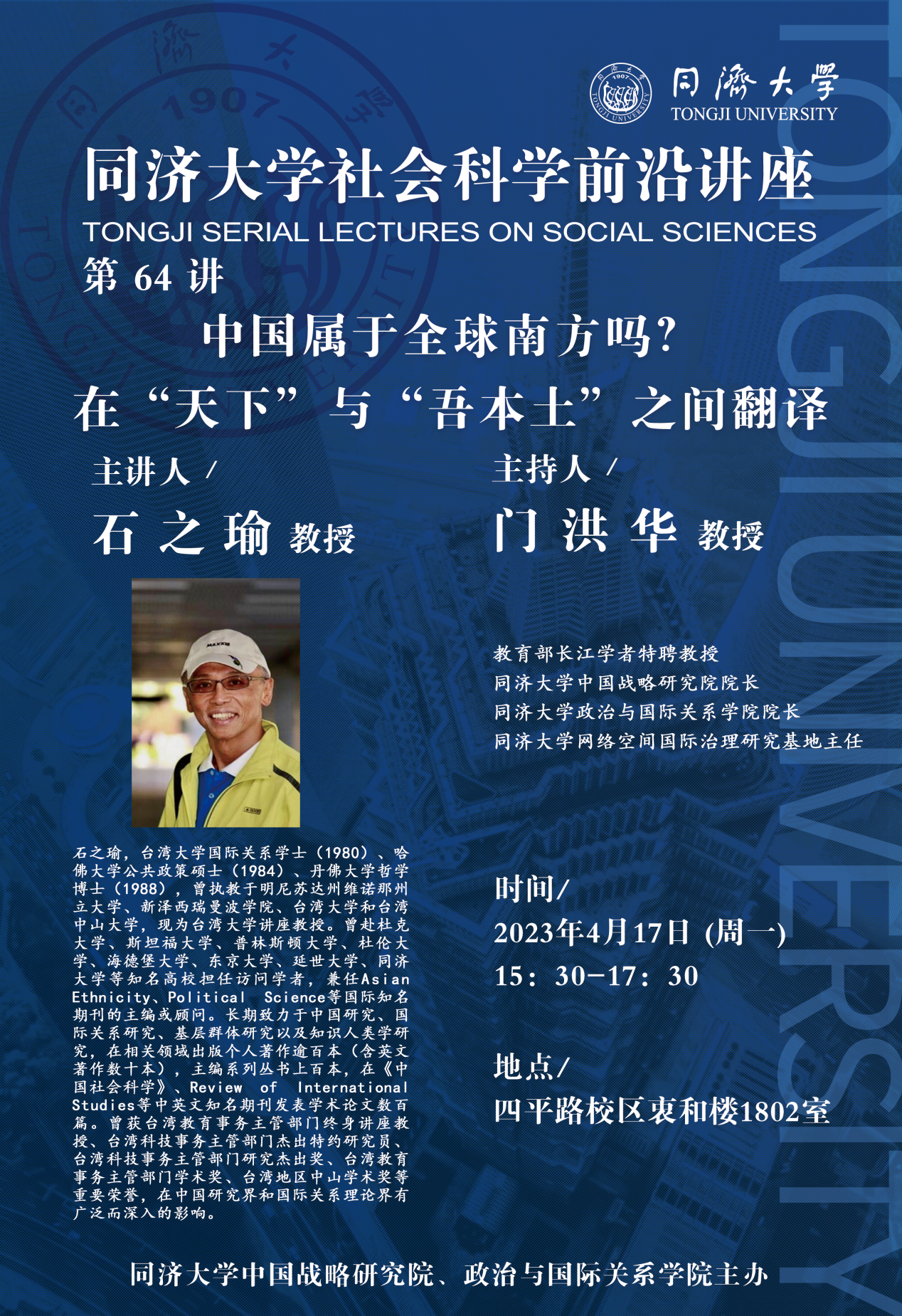 石之瑜教授,台湾大学国际关系学士(1980)、哈佛大学公共政策硕士(1984)、丹佛大学哲学博士(1988),曾执教于明尼苏达州维诺那州立大学、新泽西瑞曼波学院、台湾大学和台湾中山大学,现为台湾大学讲座教授。曾赴杜克大学、斯坦福大学、普林斯顿大学、杜伦大学、海德堡大学、东京大学、延世大学、同济大学等知名高校担任访问学者,兼任Asian Ethnicity、Political Science等国际知名期刊的主编或顾问。长期致力于中国研究、国际关系研究、基层群体研究以及知识人类学研究,在相关领域出版个人著作逾百本(含英文著作数十本),主编系列丛书上百本,在《中国社会科学》、ReviewofInternationalStudies等中英文知名期刊发表学术论文数百篇。曾获台湾教育事务主管部门终身讲座教授、台湾科技事务主管部门杰出特约研究员、台湾科技事务主管部门研究杰出奖、台湾教育事务主管部门学术奖、台湾地区中山学术奖等重要荣誉,在中国研究界和国际关系理论界有广泛而深入的影响。