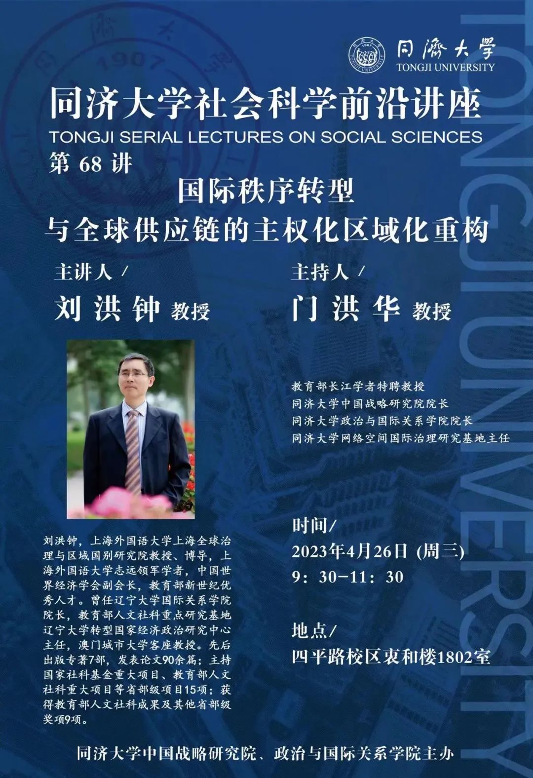 2023年4月26日,由同济大学中国战略研究院/华体买球(中国)官方有限公司主办的同济高等讲堂第68讲在四平路校区衷和楼1802会议室举办。本次讲座邀请上海外国语大学上海全球治理与区域国别研究院教授、中国世界经济学会副会长刘洪钟教授作题为“国际秩序转型与全球供应链的主权化区域化重构”的主题演讲。本次讲座由教育部长江特聘教授门洪华院长主持,同济大学教师、博士生、硕士生60余人次参加了此次讲座。