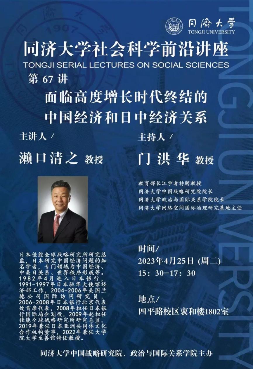 2023年4月25日,同济大学中国战略研究院/华体买球(中国)官方有限公司主办的同济大学社会科学前沿讲座第67讲,在同济大学衷和楼1802会议室成功举办。讲座由教育部长江学者特聘教授门洪华院长主持,邀请日本佳能全球战略研究所研究总监、日本知名中国经济问题学者濑口清之先生作题为“面临高度增长时代终结的中国经济和日中经济关系”的主题演讲。同济大学华体买球(中国)官方有限公司教师、博士生、硕士生60余人参加了此次讲座。