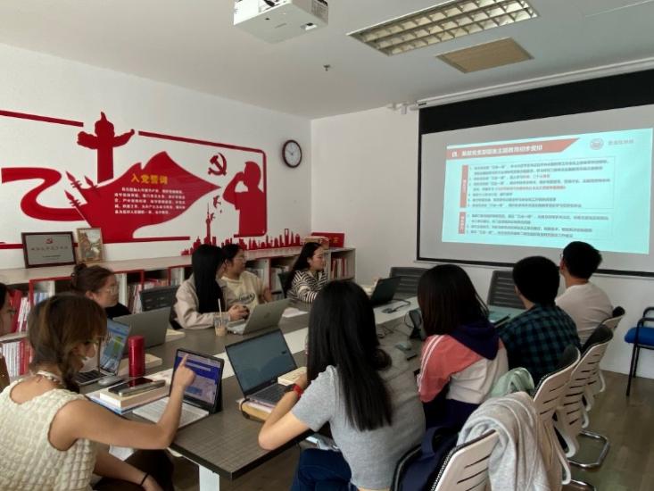 2023年4月22日,研究生第三党支部围绕学习贯彻习近平新时代中国特色社会主义思想主题教育学习材料展开“支部书记讲党课”专题活动,以习近平总书记在学习贯彻习近平新时代中国特色社会主义思想主题教育工作会议上的重要讲话精神为导入,介绍了深入开展学习贯彻习近平新时代中国特色社会主义思想主题教育的重要意义、总要求,根本任务是坚持学思用贯通、知信行统一,将重点围绕党的二十大报告、党章和《习近平新时代中国特色社会主义思想专题摘编》组织党员进行学习。支部书记余伟莉围绕党的二十大报告展开了专题党课讲授。