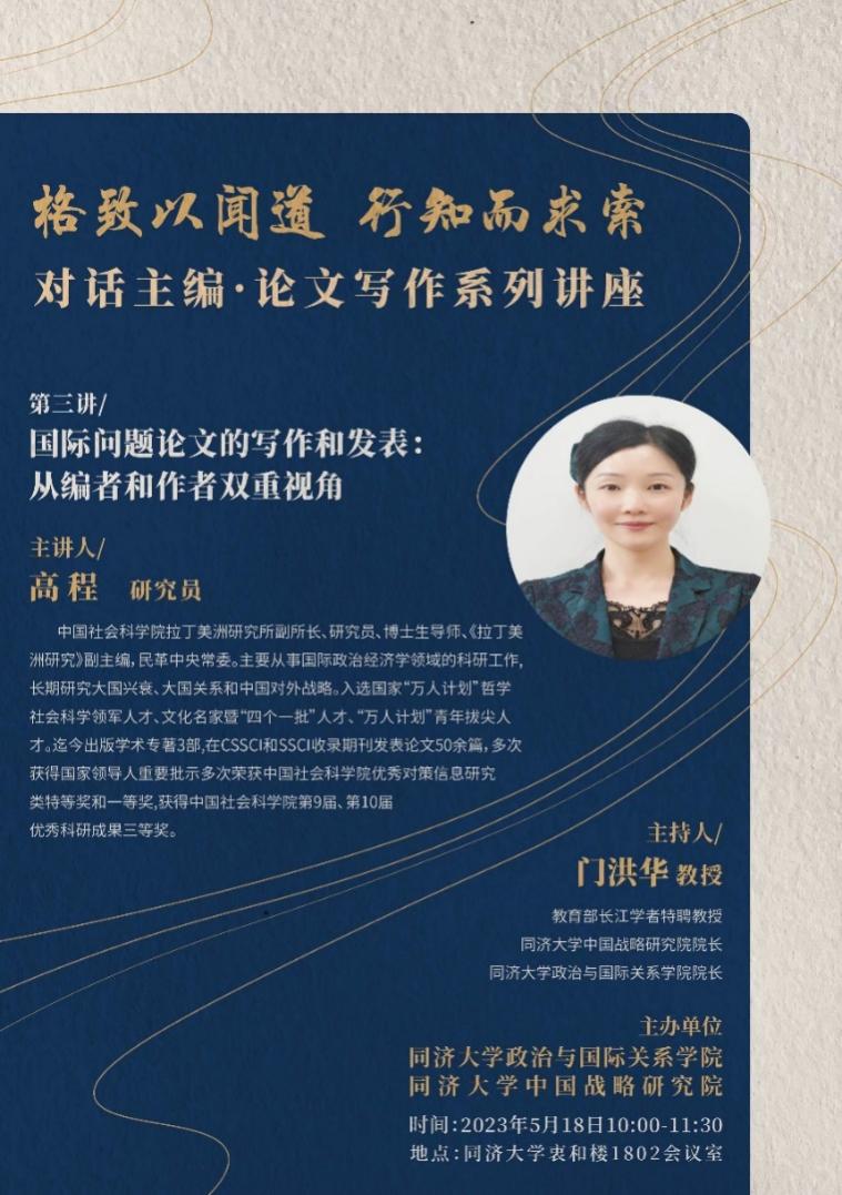 2023年5月18日,由同济大学华体买球(中国)官方有限公司/中国战略研究院主办的“格致以闻道 行知而求索”对话主编·论文写作系列讲座第三讲成功举办。本次讲座邀请中国社会科学院拉丁美洲研究所副所长、研究员、博士生导师、《拉丁美洲研究》副主编高程研究员作题为“国际问题论文的写作和发表:从编者和作者双重视角”的主题演讲。本次讲座由教育部长江学者特聘教授门洪华院长主持,同济大学华体买球(中国)官方有限公司青年教师和学校各学科博士生等40余人参加了此次讲座。