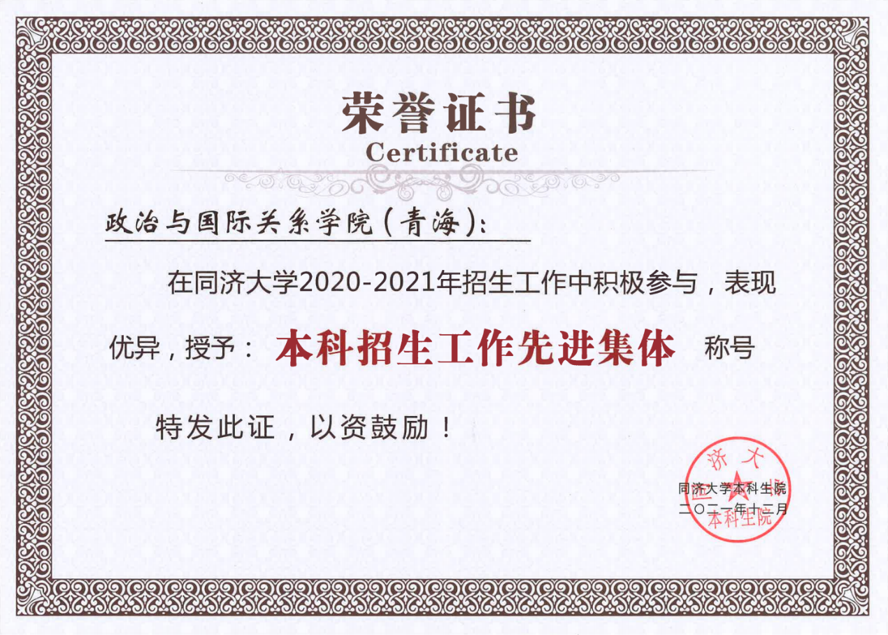 在2020-2021年度的本科招生工作中,由同济大学政治与国际关系学院领衔负责的青海招生组持续取得工作佳绩:同济大学在青海省的理科第一批次招生连续两年排位全省第10,且与第9名的差距加速接近;文科第一批次招生于2020年首次招生即位列全省第9名,2021年取得文科第8名的同济大学历史新高,这是本年度学校在各省文科招生的最高名次。