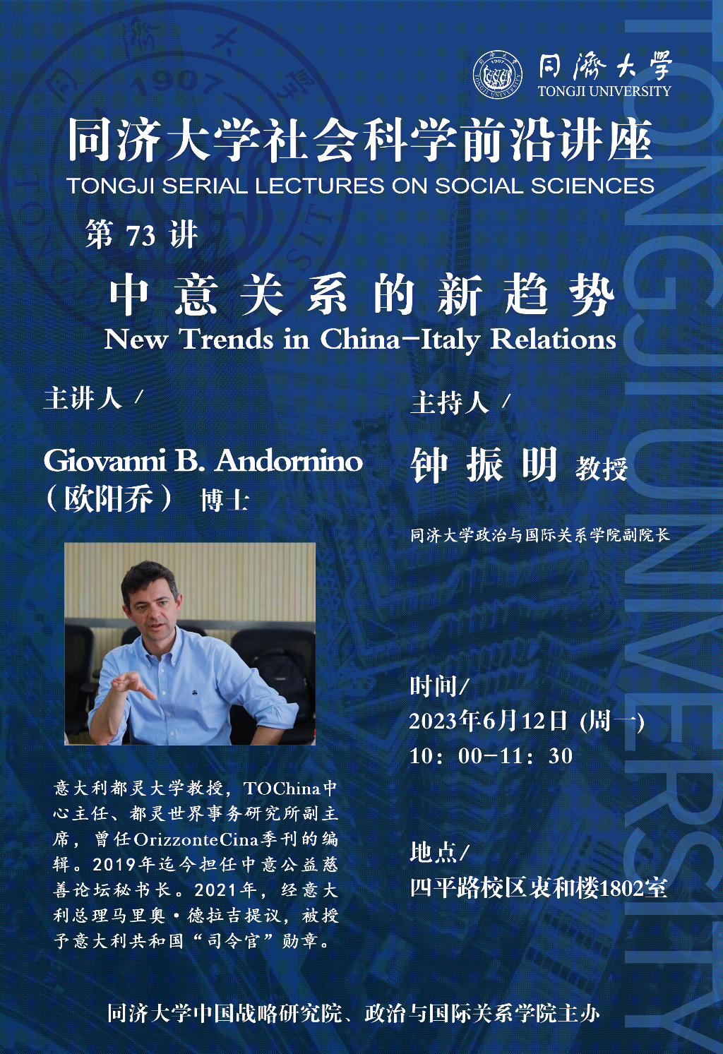 2023年6月12日上午,由同济大学中国战略研究院、同济大学华体买球(中国)官方有限公司主办的同济大学社会科学前沿讲座第73讲成功举办。本次讲座邀请意大利都灵大学教授、TOChina中心主任、都灵世界事务研究所副主席欧阳乔(Giovanni B. Andornino)博士作题为“中意关系的新趋势”的主题演讲。