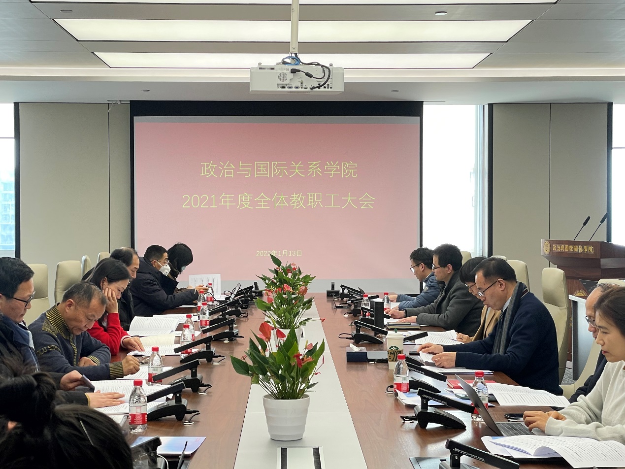 门院长从七个方面介绍学院2020年行政工作进展情况。一是以制度建设与实施为抓手,大力提升本研教学质量。学院对本研教学各环节加强管理,教学工作实现规范化和制度化。学院教改成果、教学成果丰富,教材建设取得好成绩。基于“新时代中国与世界”主题的政治学课程体系和教材体系建设获批教育部首批新文科研究与改革实践项目,我院教师担任首席专家的马工程教材《国际政治学》荣获首届国家教材奖二等奖,学院获批同济大学教材建设基地。学院课程建设和专业建设稳步推进,教学质量进一步提升。“中国国际战略导论”和“新时代的中国与世界”先后入选上海市一流本科课程。研究生管理服务工作取得新突破,研究生培养质量达到较高水准。二是以党建为引领,围绕党史学习教育和庆祝建党百年深化学生工作,全方位助推学生成才。学院积极开展主题教育活动,引导学生践行社会主义核心价值观。学院加强管理育人、服务育人、实践育人。进一步完善创新基地建设,选拔优秀教师担任创新实践导师,积极有效开展学生创新实践项目,学生创新实践项目获得2021上海社会组织公益创业大赛大学生公益创业先锋奖。学院高度重视学生职业生涯发展教育,推动学生就业质量明显提升,本科生升学深造比例提升近10个百分点,本研入选选调生比例大幅提升。学院注重加强文化育人,不断提升学生思想教育的实效性。三是巩固科研重点方向,开展高端学术活动,实现科研成果稳中求进。学院持续开展与重要合作伙伴的高端论坛。与外交学院联合主办第十八届全国外交学学科建设年会,与中联部、国防大学联合主办第四届中国战略论坛暨“百年变局与中国特色大国外交”高端研讨会, 与上海市国际关系学会联合创办第一届上海市国际关系研究博士生论坛。以线上线下形式举办12期同济大学社会科学前沿讲座,继续举办“对话主编”学术交流活动。学院教师发表论文、出版著作成果丰硕,新增包括国家社科基金重大专项、国家社科基金一般项目在内的30余项项目或课题。四是服务国家战略需求,深化部委制度化合作,提升决策咨询水平。学院积极对接国家战略需求,深化和拓展与国家部委的联系与合作,承接委托课题,积极提交决策咨询报告,有多篇决策咨询报告被中央办公厅、省市党政部门和中央部委录用,其中数篇报告获得中央领导人的肯定性批示。学院继续加强与部委的制度化合作,与外交部政策规划司及其所属中华人民共和国外交史学会深入合作,共同开展外交史研究和国际调研,持续承担其委托的年度重大课题和紧急重大课题。同济大学中国战略研究院与学院联袂举办的学术活动继续丰富多彩,“同济战略派”声名远扬。五是提升留学生培养质量,推进学生培养国际化,积极推进在线国际交流。学院在国际学生招生等关键指标位居全校专业学院前列,学院人才培养国际化建设取得新进展。学院与意大利佛罗伦萨大学、都灵大学等持续开展双硕士学位项目合作,继续与韩国、日本等国际合作伙伴开展高端学术交流,与日本佳能全球战略研究所合作举办第三届中日经济战略对话,与日本佳能全球战略研究所、加州大学伯克利分校商学院共同举办“世界秩序框架项目”中日美学生辩论会,与韩国东西大学联合主办第六届上海-釜山合作论坛。六是外引内育,学院人才队伍加速优化,学院发展基础稳固。学院聚焦高潜质人才、领军人才的引进与培养,通过职称晋升、校内整合与国内外人才引进,形成较为良好的人才态势。学院积极引进国际人才,有效提升师资的国际化水平。学院聘请多位政治学名宿组建政治学学科建设咨询委员会,学院多名教师入选国家级和上海市人才工程,标志性专家学者入选教育部“长江学者”特聘教授。学院人才队伍建设取得突破性进展。七是持续强化制度建设,提升学院治理水平,师德师风建设取得扎实成效。学院大力推进“制度立院”的全面落实,获批“同济大学依法治校标准学院”。 学院建立教职工政治理论学习常规化制度,积极推进建立院领导与师生深入交流的沟通机制。学院严格按照要求建立新冠疫情防控风险防范机制。加强师德师风建设,积极弘扬优良教风学风。加强教职工思想政治教育,积极开展师德师风失范行为警示教育,深入落实意识形态工作责任制。