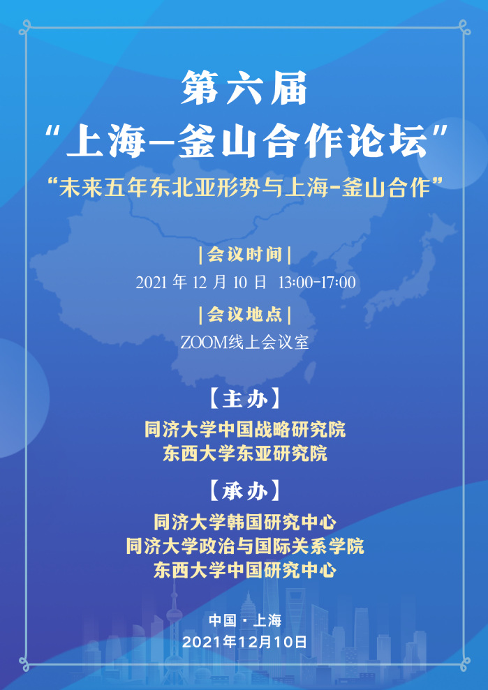 2021年12月10日,由同济大学中国战略研究院、韩国东西大学中国研究中心联合主办的第六届上海-釜山合作论坛成功举办。此次论坛会议由同济大学华体买球(中国)官方有限公司、同济大学韩国研究中心承办,中韩方参会专家在线上参与论坛研讨。参加此次论坛的有来自同济大学、中国国际问题研究院、北京大学、复旦大学、吉林大学、上海师范大学等单位的30多位专家学者和学生代表。中国国际问题研究院党委书记兼院长徐步大使、中国原驻韩国大使、同济大学韩国研究中心名誉主任宁赋魁、中国原驻韩国大使邱国洪出席。韩方有来自东西大学、加图立大学、国立外交院、国立釜山大学、同德女子大学、釜山国际交流财团等机构的10余位专业学者。韩国东西大学东亚研究院院长、韩国原驻中国大使辛正承教授和韩国原驻印度尼西亚大使李先镇出席。