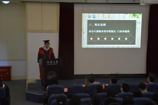 新院徽启动仪式后,院长门洪华教授向在场的毕业生们发表了热情洋溢的致辞。门院长首先代表全院师生向2017届毕业生们致以最热烈的祝贺,向亲人和师生致以最衷心的感谢。其次,门院长向大家详细阐述了自2016年10月学院新领导班子组建以来的施政价值、工作宗旨和理念目标,并从“规范管理,制度先行”、“凝练方向,突出特色”、和“以人为本,锐意改革”三个方面所取得进展进行了具体解读。最后,门院长在临行之际,送给在座的毕业生们三句嘱托:“心存善念,胸怀感恩”、“博学慎思,明辨笃行”和“严以修身,兼济天下”。希望大家能够带着同济所浸润出的非凡气质,以梦为马,莫负韶华,让青春的鲜活与亮丽在未来尽情地绽放,祝愿每一位2017届的毕业生牢记同舟共济的精神,扬帆起航,迈向人生的一个又一个辉煌。