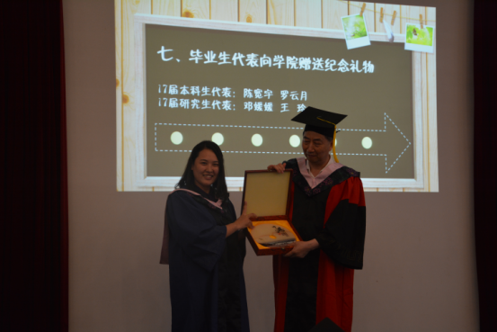 为了表达对学院、对导师的感恩和祝福,毕业生们除了节目汇报之外,还精心准备了别致的纪念礼物赠予学院,一日师恩,终身难忘;一朝国政人,一生国政情。党委书记徐红教授和教授委员会主任仇华飞教授代表学院郑重接收并合影留念。