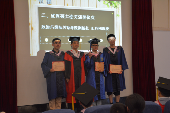 此次,我院在研究生硕士论文方面进行了较为重大的改革,更加注重对硕士生学术品质和毕业论文质量的把控。毕业典礼上,学院兑现了之前对所有硕士生的承诺,对优秀硕士毕业生论文予以隆重的表彰。经过学院评委会的严肃评议,授予张啸然、张耀和姚亮亮三位同学所撰写的毕业论文为2017届优秀硕士生毕业论文。副院长王存刚教授为三位同学进行了优秀硕士生论文的颁奖仪式。
