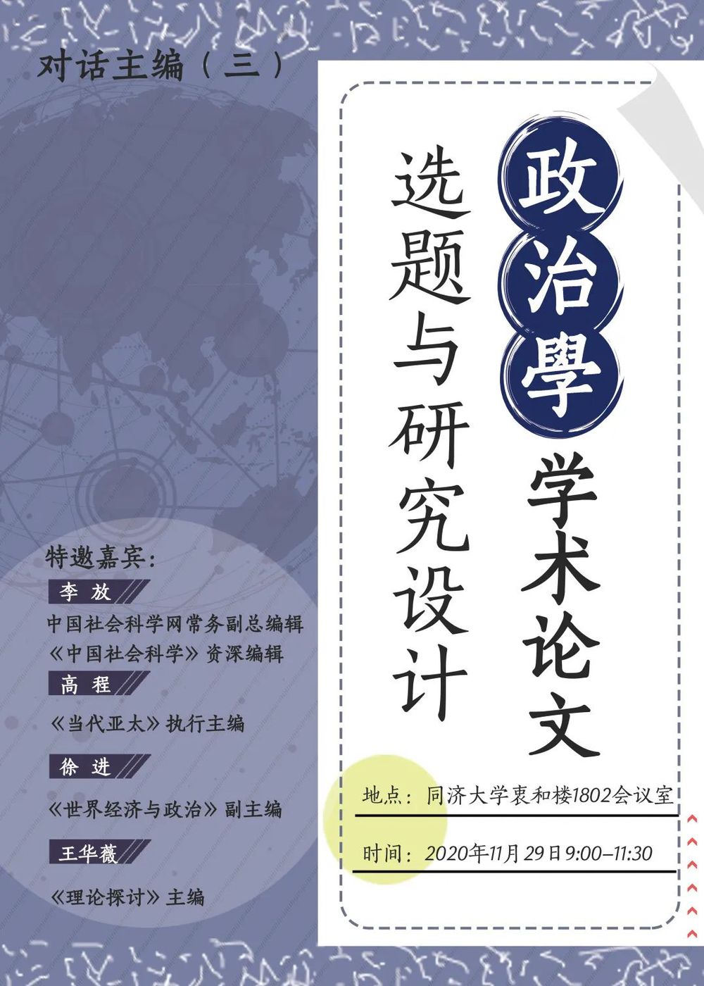 2020年11月29日,由同济大学中国战略研究院、同济大学政治与关系学院主办的第三次“对话主编”学术交流会议在同济大学衷和楼1802会议室成功举行。本次会议特别邀请到中国社会科学网常务副总编辑、《中国社会科学》资深编辑李放编审、《当代亚太》执行主编高程研究员、《世界经济与政治》副主编徐进研究员和《理论探讨》主编王华薇四位嘉宾,围绕“政治学学术论文选题与研究设计”主题,分别立足于各自期刊的风格,就如何选好题、写好论文提出许多意见和建议。