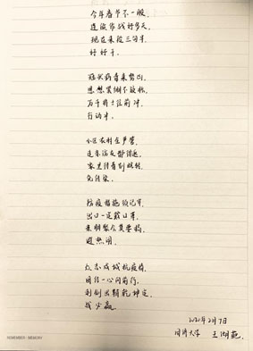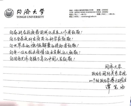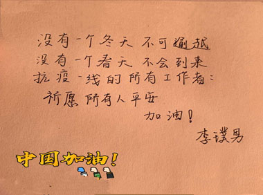 作为青年学子我们时刻关注疫情,通过各种方式为抗疫工作贡献自己的力量,展现当代大学生的责任和担当。在此,华体买球(中国)官方有限公司研究生第三党支部开展线上组织生活会,为共同打赢这场特殊的战斗,贡献党员力量。组织成员通过手写加油接力,写下对在一线奋战工作者的感谢与支持以及对武汉对国家的支持和祝福。