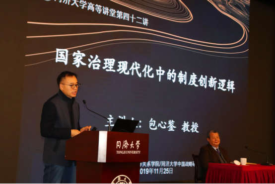 2019年11月25日,由同济大学中国战略研究院、同济大学华体买球(中国)官方有限公司主办的同济大学社会科学前沿讲座第20讲暨同济大学高等讲堂第42讲在同济大学四平路校区逸夫楼一楼报告厅成功举办。本次讲座主题为“国家治理现代化中的制度创新逻辑”,演讲嘉宾为中国政治学会副会长、山东省社科联原党组副书记兼副主席、山东大学特聘教授、济南大学政法学院名誉院长包心鉴教授。同济大学华体买球(中国)官方有限公司院长门洪华教授主持本场讲座。