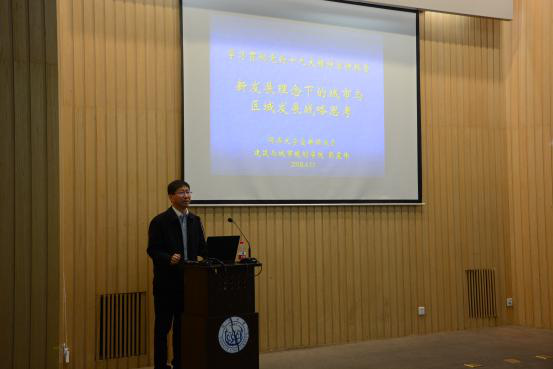 2018年4月17日下午,院党委组织学院全体教师、学生党员和积极分子在衷和楼10楼报告厅举办学习贯彻十九大精神专题报告会,邀请同济大学十九大精神宣讲团成员、建筑与城市规划学院党委书记、著名城乡规划专家彭震伟教授做题为“新发展理念下的城市与区域发展战略思考”的专题报告。报告会由学院党委书记徐红教授主持,门洪华院长和学院党政班子其他成员集体参加了学习。