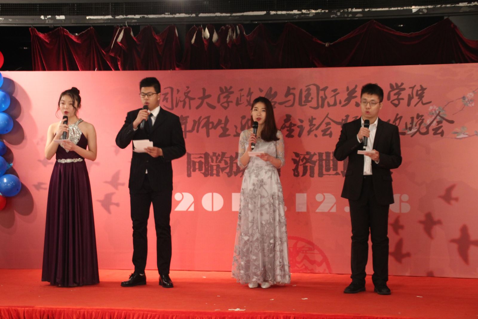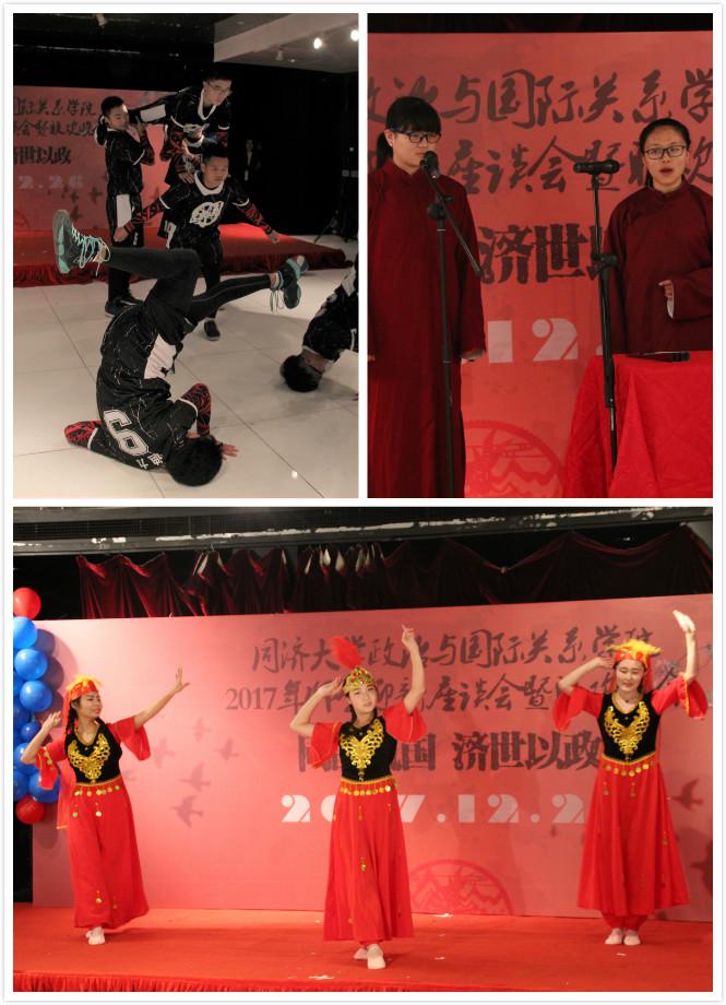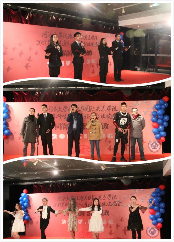 2017年12月26日,同济大学华体买球(中国)官方有限公司“同韵筑国,济世以政”师生迎新座谈会和迎双新联欢晚会圆满举办。学院院长门洪华教授、党委书记徐红书记出席,党委副书记宋波老师、副院长王存刚教授、院长助理钟振明老师、院长助理孙明老师、政治学系系主任孙磊老师及各专业教师代表参加座谈会。