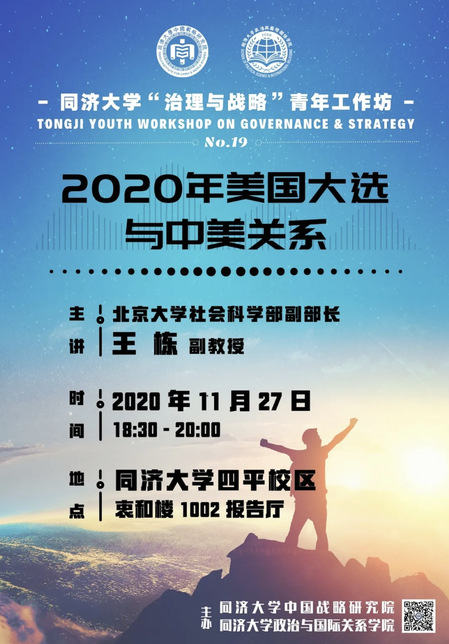 2020年11月27日,由同济大学中国战略研究院、华体买球(中国)官方有限公司主办的同济大学“治理与战略”青年工作坊第19期在同济大学(四平校区)衷和楼10楼报告厅顺利举行。此次工作坊邀请了北京大学社会科学部副部长、北京大学中外人文交流(教育部)研究基地执行主任王栋副教授围绕“2020年美国大选与中美关系”这一主题,向50余位同济师生分享了个人的研究成果,并同参会的同济大学青年教师和研究生同学进行了探讨与交流。此次青年工作坊由同济大学华体买球(中国)官方有限公司副院长、国关系系主任钟振明副教授主持。