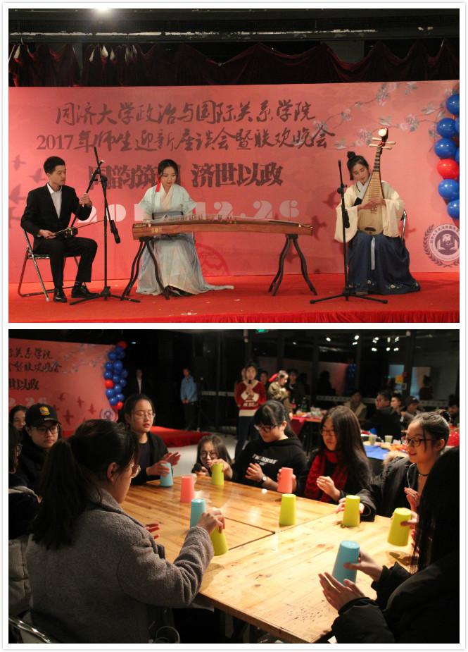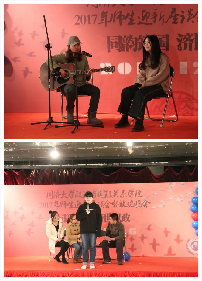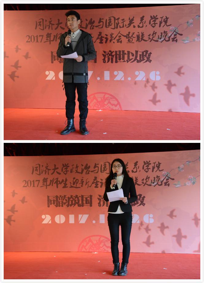2017年12月26日,同济大学华体买球(中国)官方有限公司“同韵筑国,济世以政”师生迎新座谈会和迎双新联欢晚会圆满举办。学院院长门洪华教授、党委书记徐红书记出席,党委副书记宋波老师、副院长王存刚教授、院长助理钟振明老师、院长助理孙明老师、政治学系系主任孙磊老师及各专业教师代表参加座谈会。