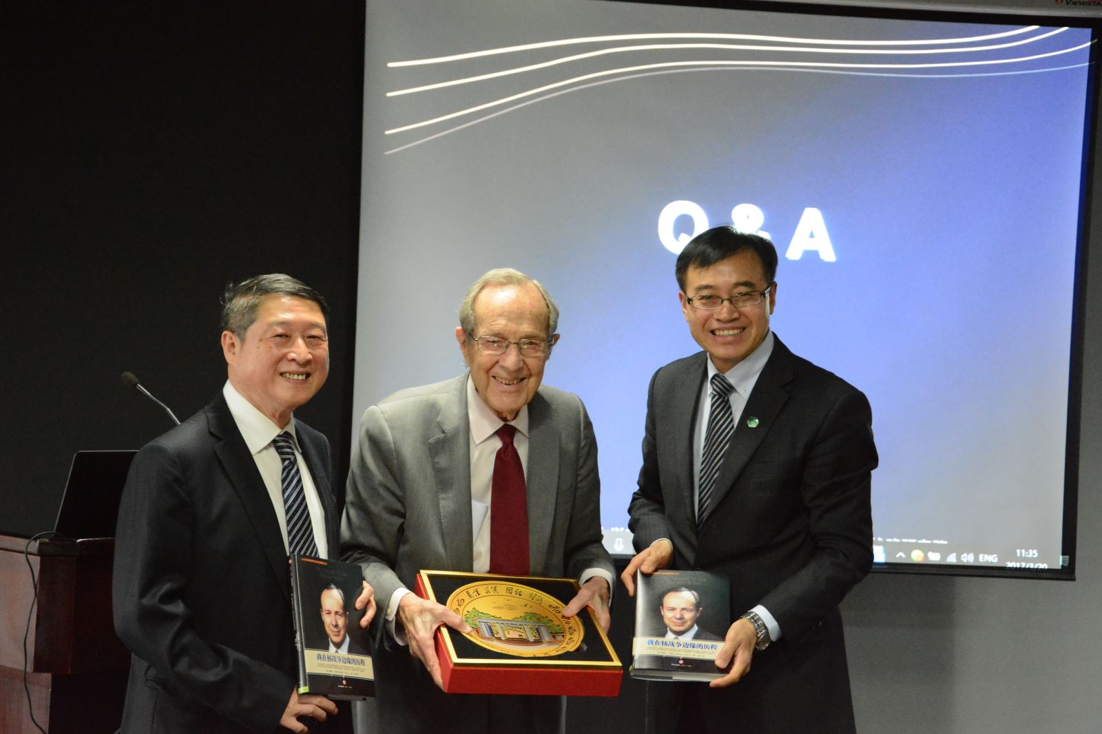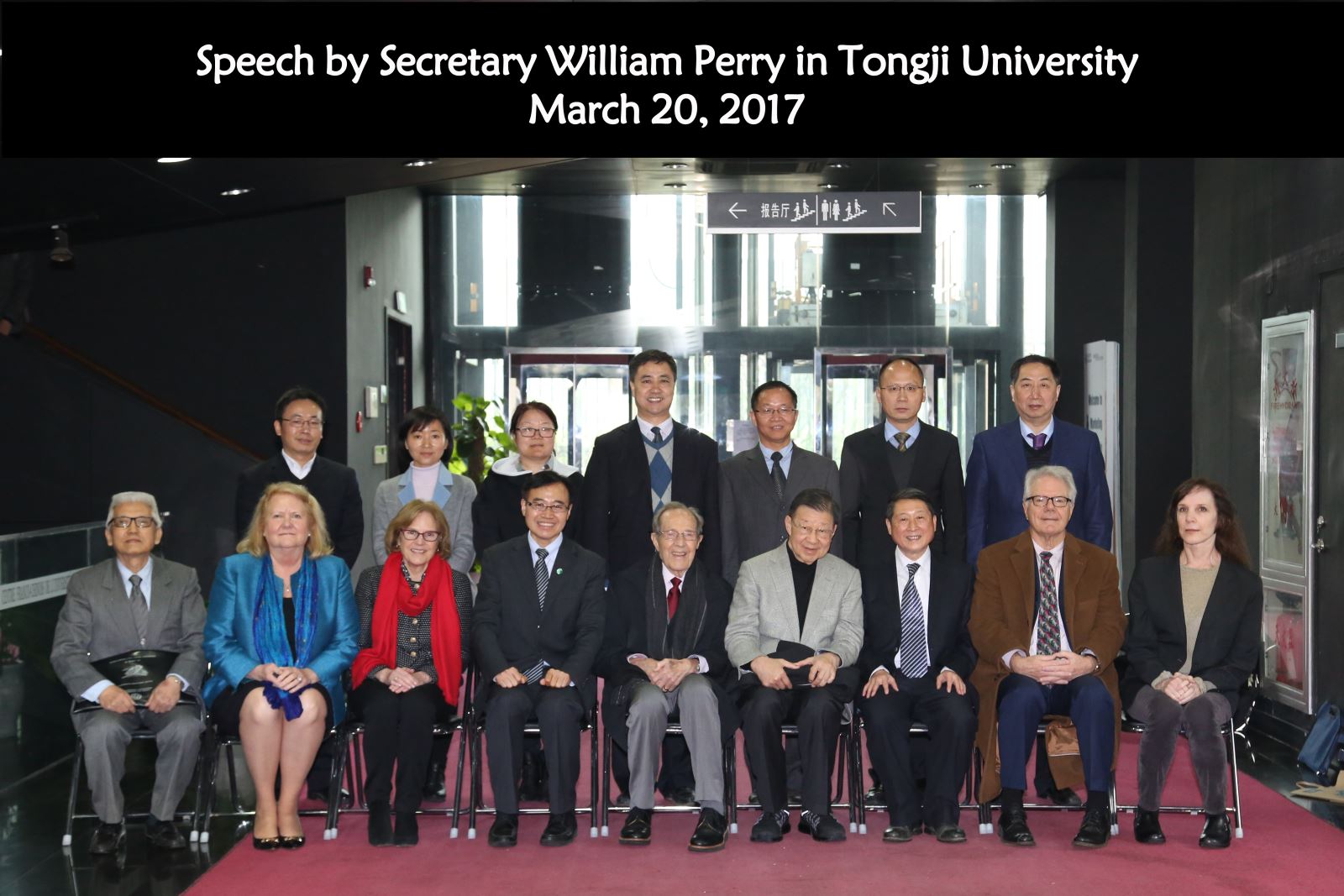 2017年3月20日,由同济大学华体买球(中国)官方有限公司、中国战略研究院共同主办的同济大学“中国与世界”名家系列讲座第八讲在同济大学中法中心成功举办。美国前国防部长、斯坦福大学胡佛研究所暨国际安全与合作中心高级研究员威廉·佩里教授(William J. Perry)与美中关系全国委员会前主席、约翰·霍普金斯大学保罗·尼采高级国际问题研究院中国系主任大卫·兰普顿(David Lampton)教授一行10人应邀访问同济大学。威廉·佩里教授在中法中心C401会议厅,发表了主题演讲。随后,大卫·兰普顿教授就中美关系的现状以及双边关系发展中的重要议题作了精彩发言。出席活动的嘉宾还有佩里的秘书黛波拉·戈登(Deborah Gordon)、佩里的两位女儿罗宾·佩里(Robin Perry)和瑞贝卡·佩里(Rebecca Perry)、威廉·佩里教授著作的译者等。同济大学华体买球(中国)官方有限公司院长兼中国战略研究院院长门洪华教授、华体买球(中国)官方有限公司院长副院长王存刚教授和郑春荣教授、华体买球(中国)官方有限公司夏立平教授、仇华飞教授、王传兴教授、潘敏教授、钟振明副教授等60余位师生参加了讲座。本次主题演讲由同济大学华体买球(中国)官方有限公司夏立平教授主持。